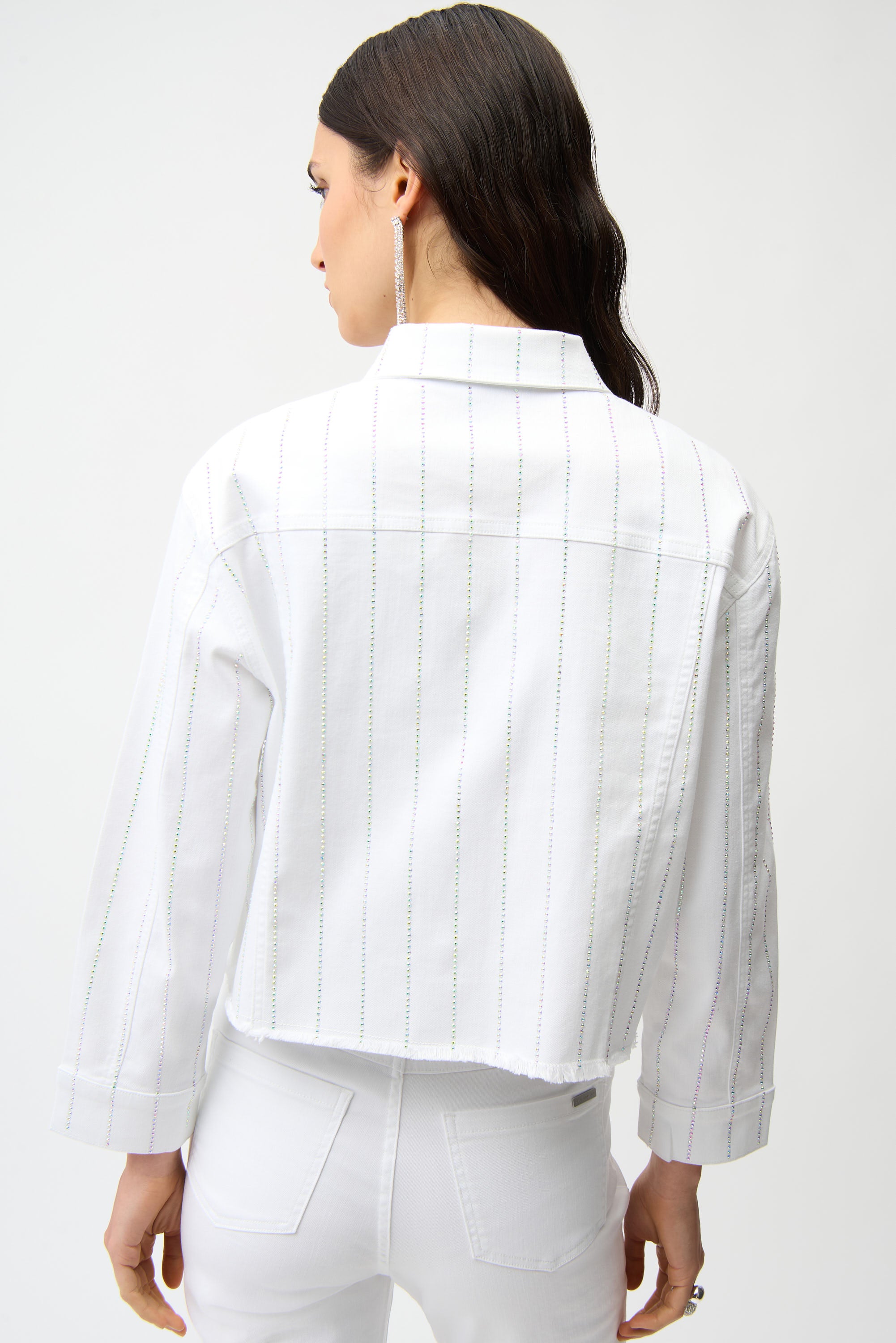 Elevate your denim game with this Joseph Ribkoff statement jacket, crafted from innovative FEATHERWEAVE™—a luxuriously soft modal blend that delivers exceptional stretch and breathability without bulk. The expertly designed silhouette combines edgy sophistication with wearable comfort, featuring eye-catching rhinestone embellishments, a deliberately frayed hem for contemporary flair, and a refined shank button closure. This lightweight layer transitions seamlessly from day to evening, offering the perfect balance of attitude and elegance for the discerning wardrobe.