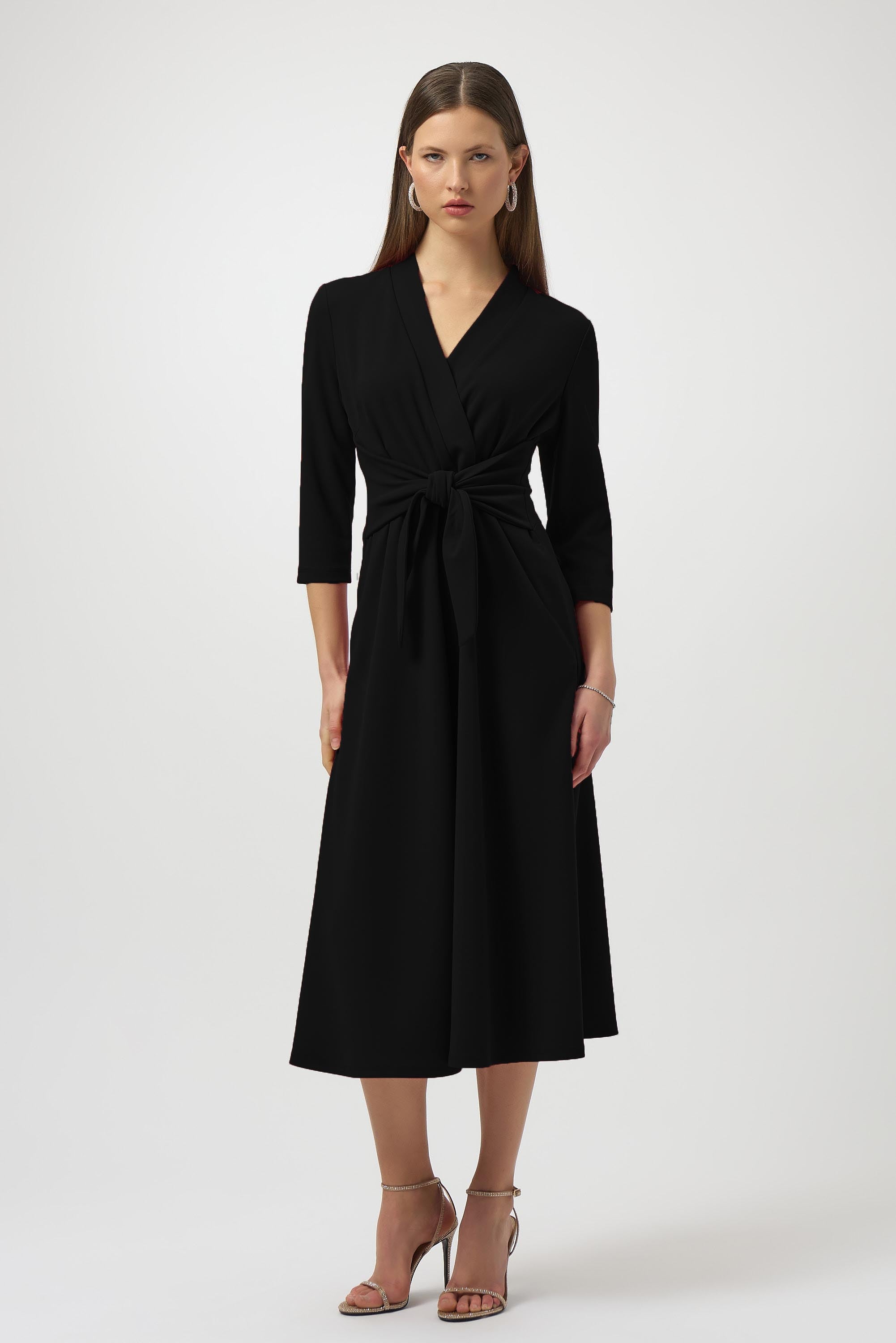 This Joseph Ribkoff Scuba Crepe Dress features a refined wrapped neckline enhanced by a delicate inserted band, exuding elegance. Its three-quarter sleeves and front waist sash emphasize the flattering fit and flare silhouette, ensuring a sophisticated and polished appearance suitable for various occasions. Crafted to combine style with comfort, this dress offers a timeless option for an expert wardrobe.