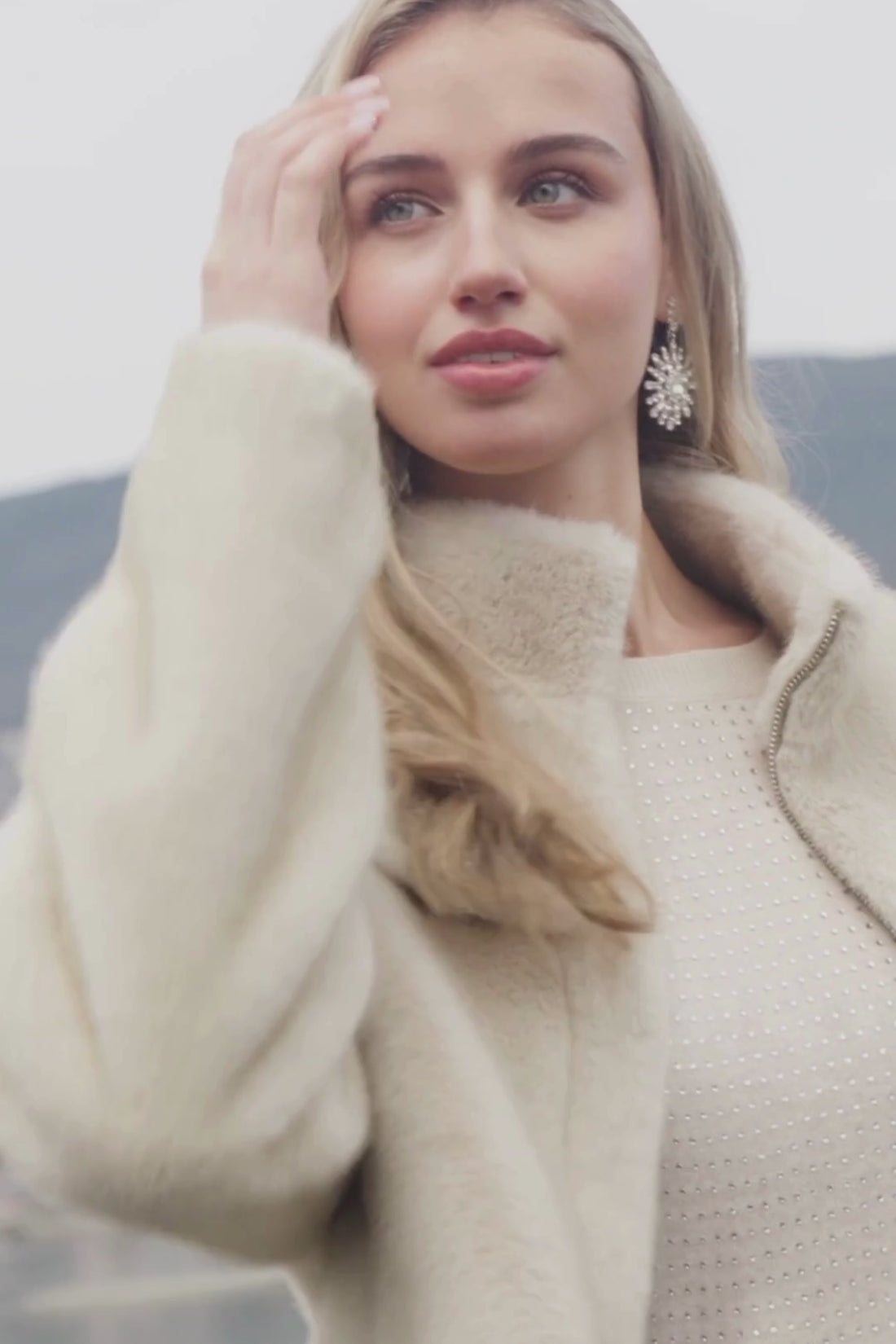 Elevate your winter wardrobe with the Frank Lyman Champagne Faux Fur Hip-Length Jacket, style 253874. This jacket combines a chic hip-length silhouette with a flattering regular fit, enhanced by a practical zipper closure for easy wear. The collared neckline and long, straight sleeves offer timeless elegance, while jewel accents and pockets add both style and functionality. Perfect for casual winter outings, this plain-patterned jacket seamlessly integrates into a feminine, everyday look with expert craftsmanship and thoughtful design.