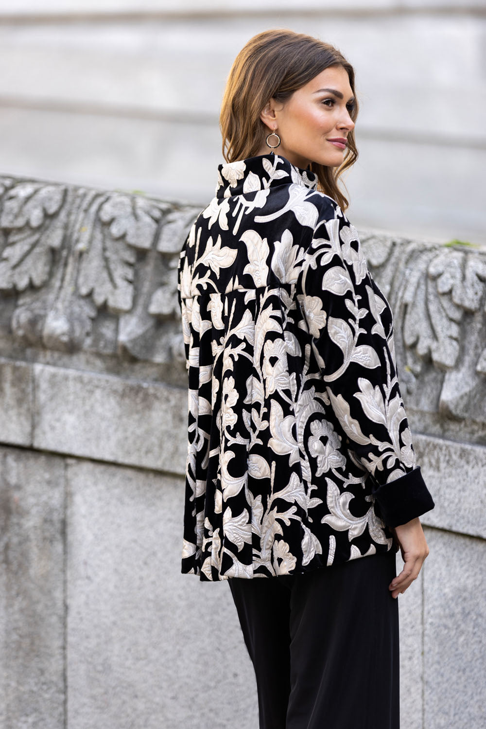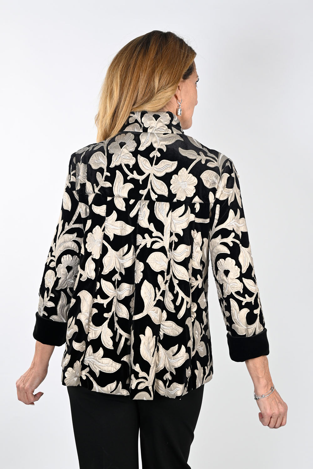 The black 3-button knit jacket boasts a sophisticated charm, complemented by its exquisite champagne floral pattern, adding a touch of elegance to any ensemble. This versatile piece effortlessly combines timeless style with modern design, making it a captivating choice for both casual outings and formal occasions.