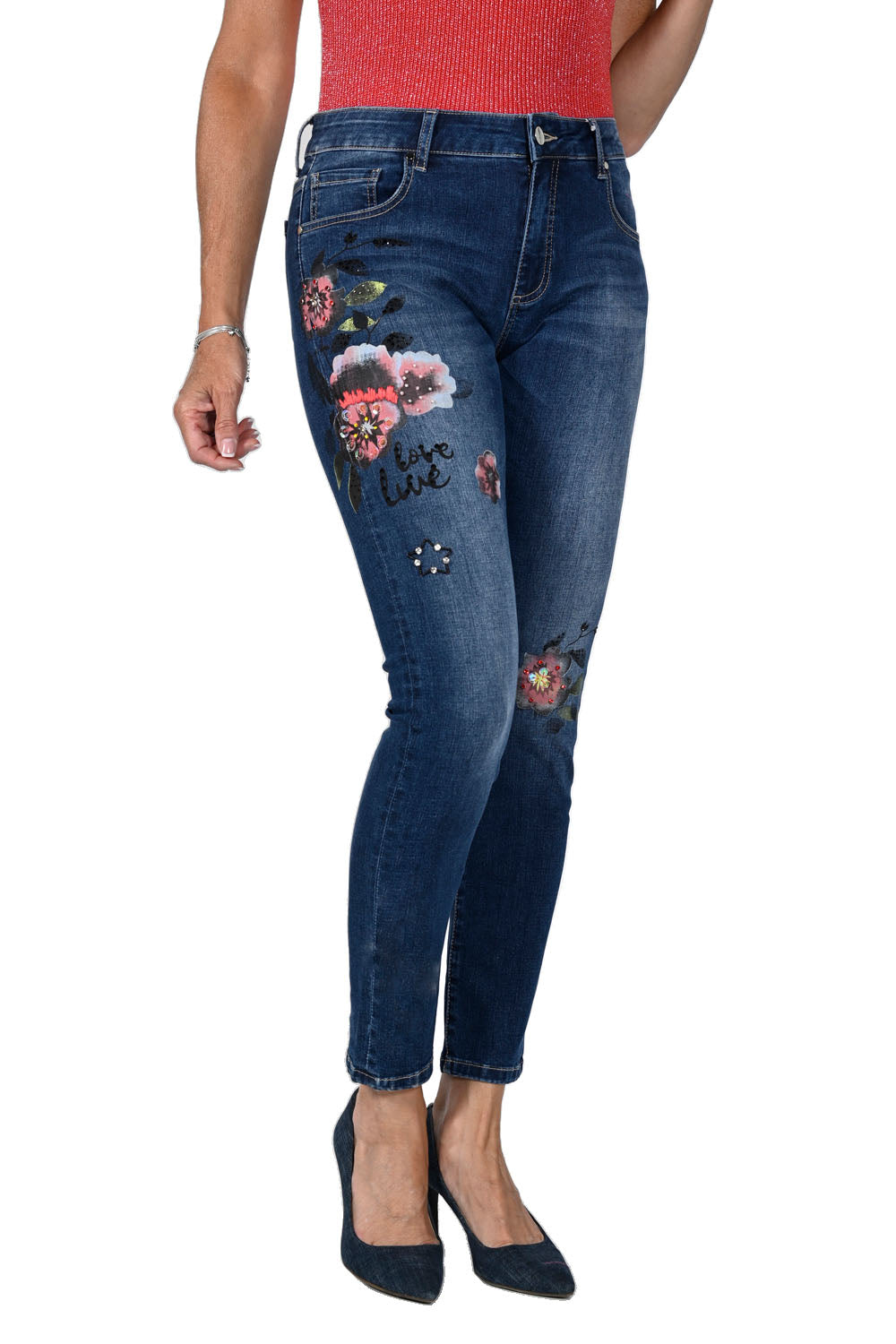 These denim jean pants combine casual and playful elements for a unique and stylish look. The floral embellishments and wording add a touch of personality and charm, making these pants a standout choice for those looking to make a fashion statement.