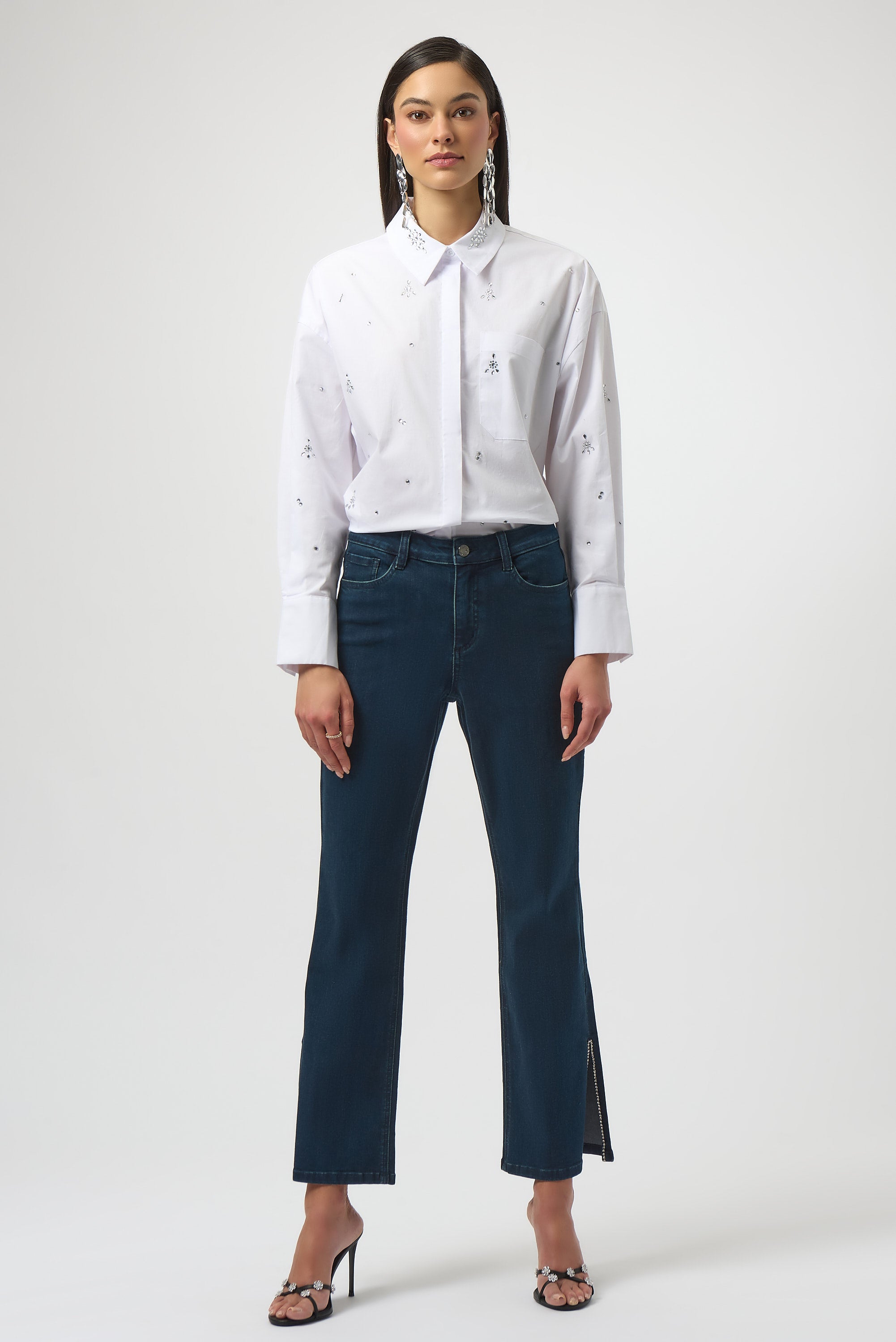These Joseph Ribkoff jeans combine classic straight-leg style with modern elegance, featuring shimmering rhinestone accents at the hem slits. Made from soft Repreve® denim, crafted from recycled plastic bottles, they provide a flattering fit that contours your shape comfortably. Experience sustainable fashion without compromising on style or comfort.