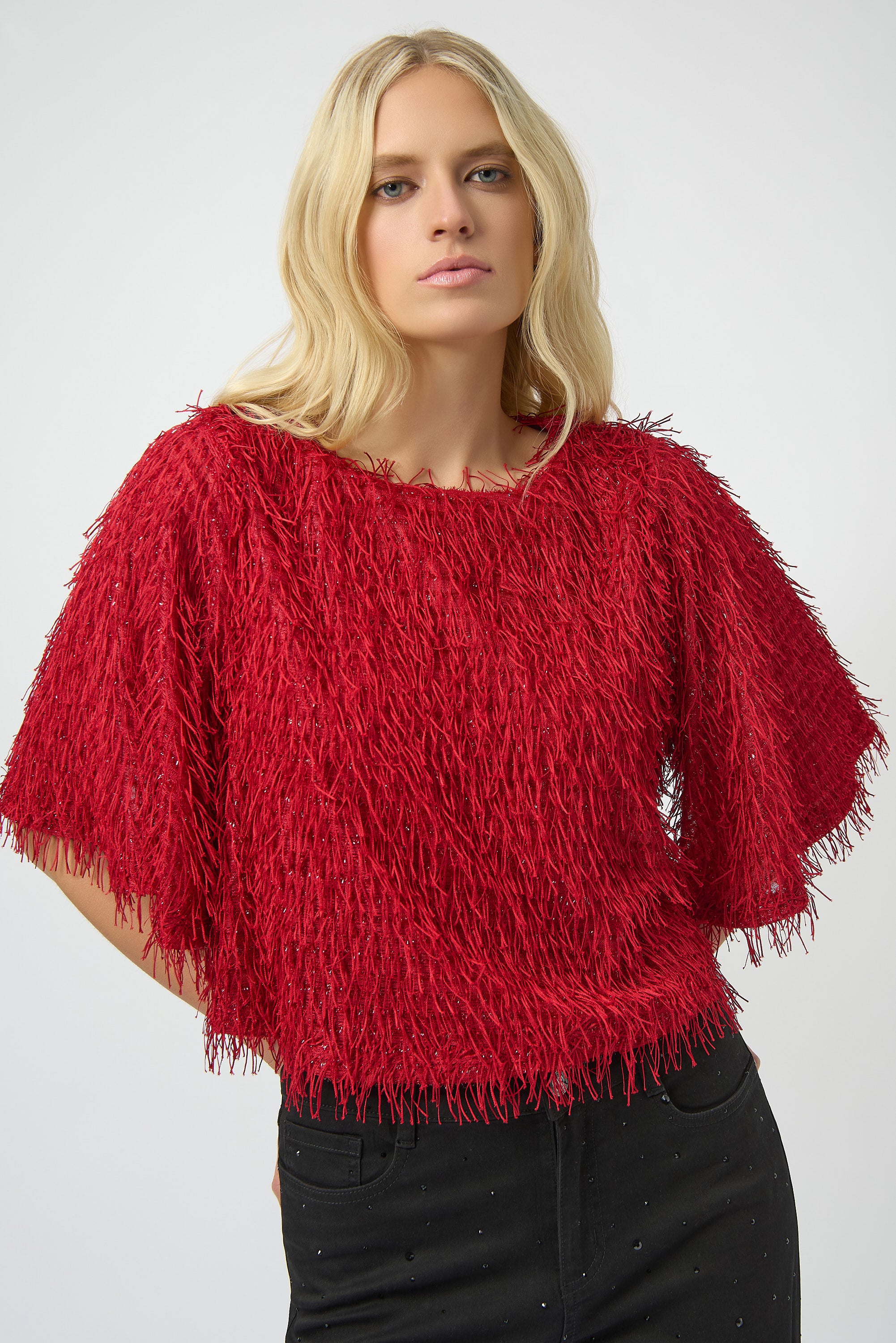This Joseph Ribkoff knit crop top features a distinctive boxy silhouette paired with elegant bell sleeves, creating a refined yet contemporary look. Crafted from novelty fringe fabric, it brings dynamic movement and texture to your outfit, making it an exceptional choice for stylish layering or standalone wear.