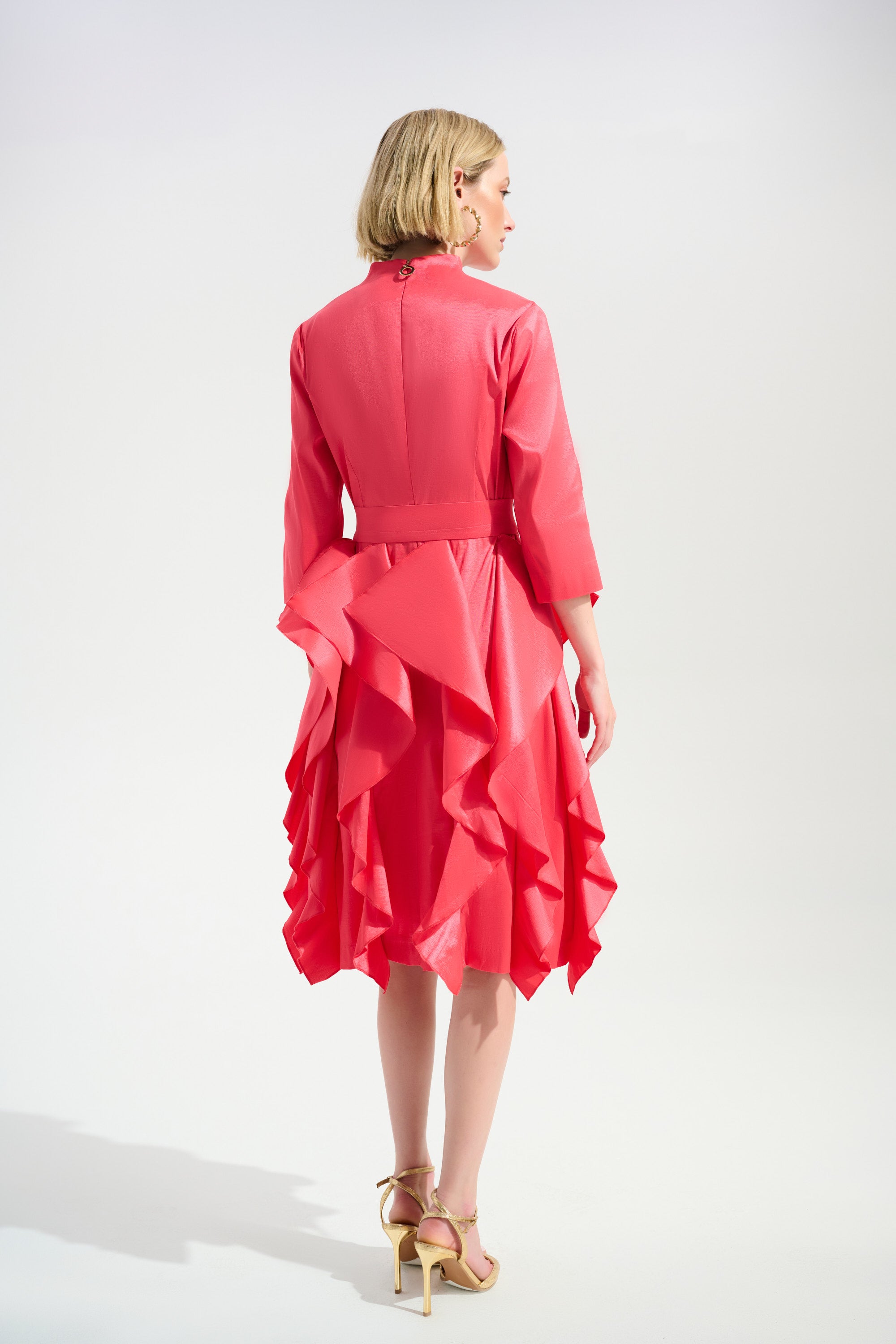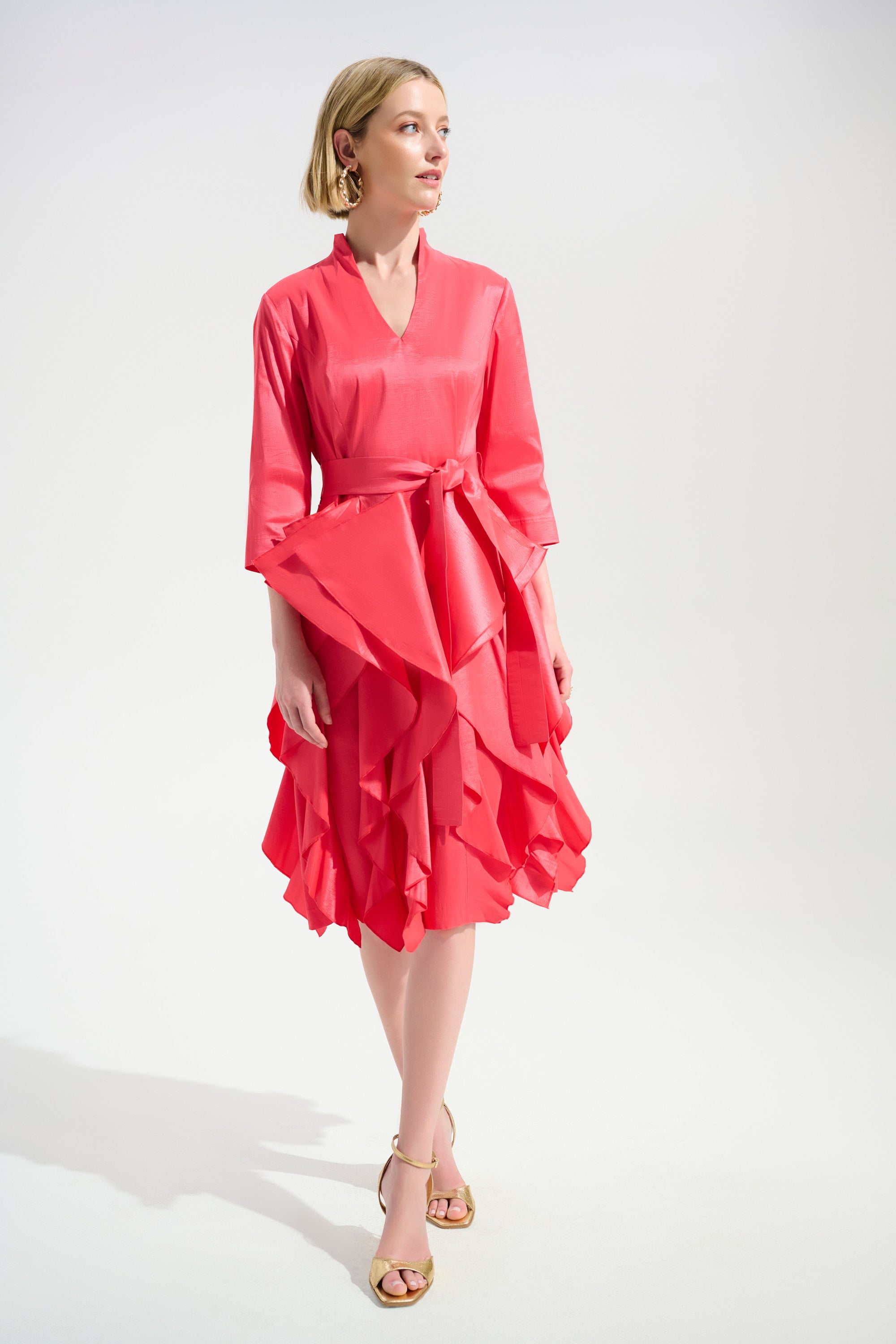 Details: V-neckline with mini collar. Three-quarter sleeves. Tiered ruffle skirt. Waist sash belt. Invisible back zipper closure. Unlined.