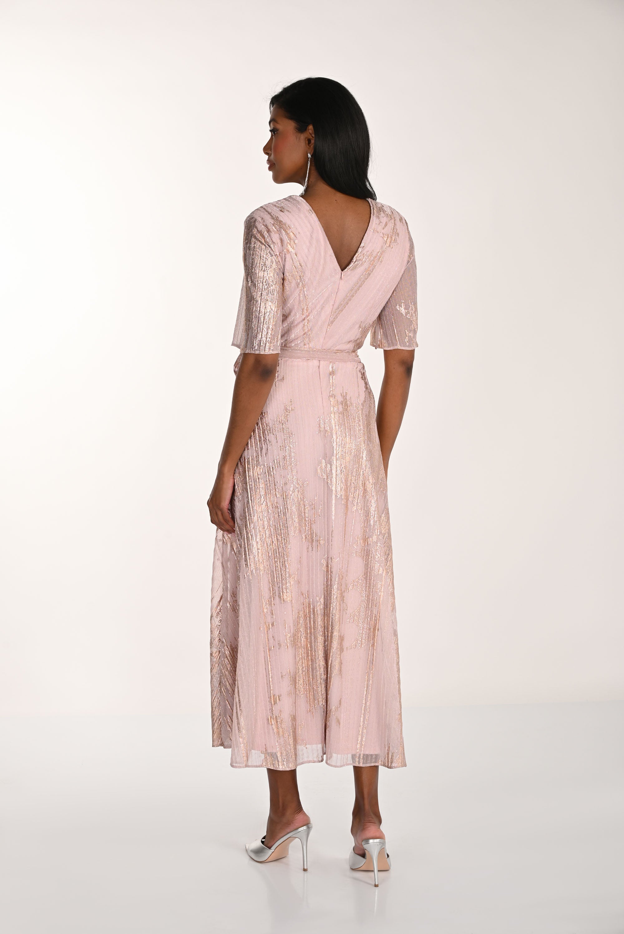 The Frank Lyman midi wrap dress epitomizes refined elegance with its thoughtfully designed silhouette. A defined belted waist creates a flattering, sculpted shape, while the V-neckline and foil print detailing deliver understated sophistication. Flutter sleeves add a graceful, feminine dimension without compromising the dress's polished aesthetic. This versatile piece transitions seamlessly from formal events to evening occasions, offering the kind of timeless appeal that transcends seasonal trends. Crafted for the discerning wearer who values both comfort and cultivated style.