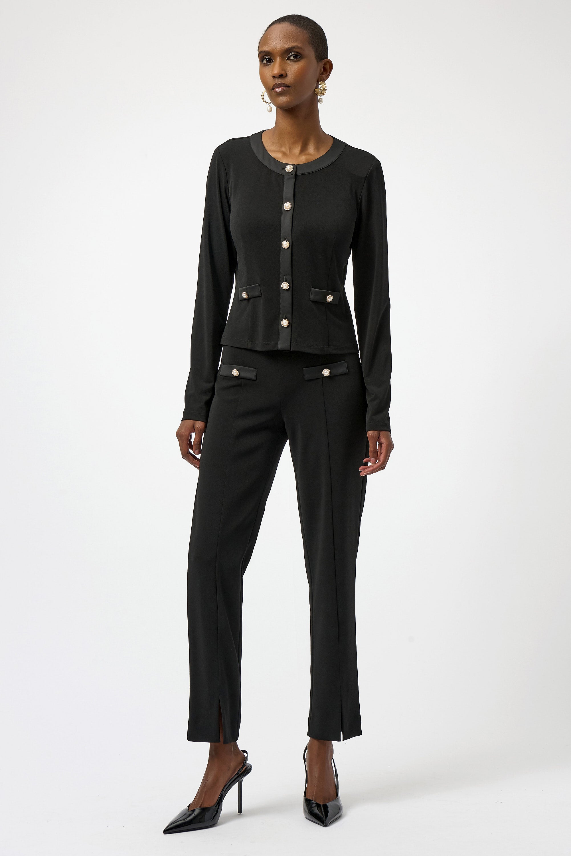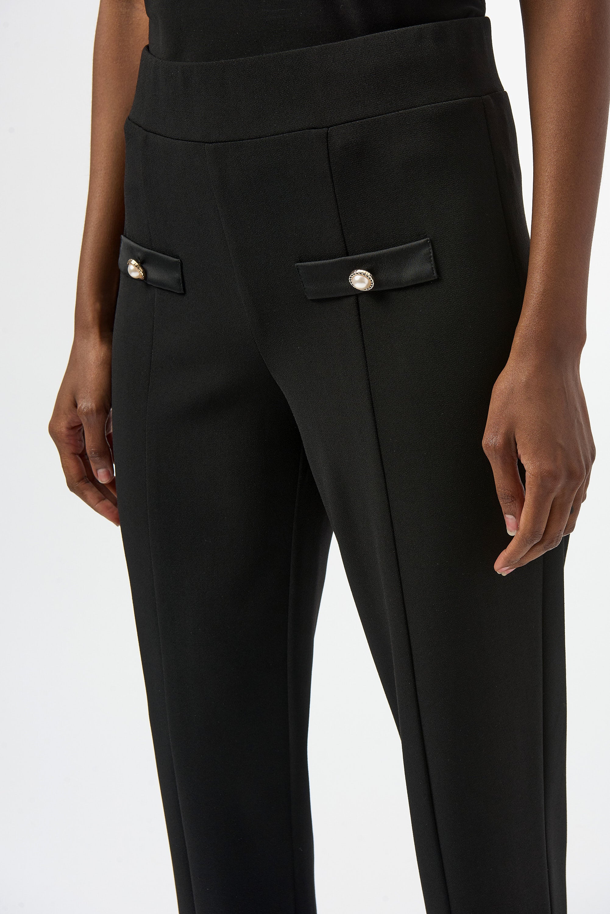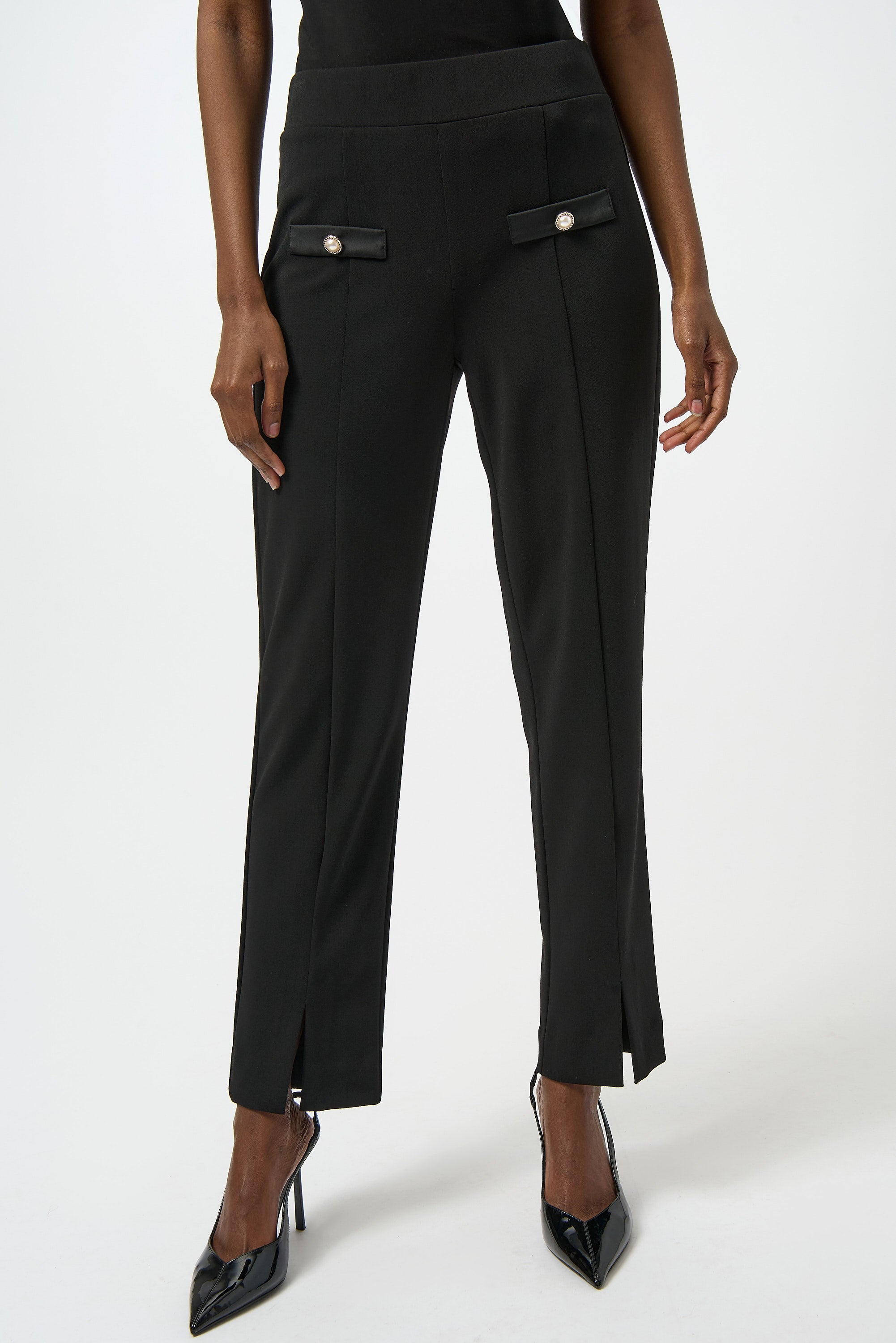 These Joseph Ribkoff black straight pull-on pants are crafted from soft moss crepe for a lightweight and comfortable fit. Featuring satin-trimmed pockets with pearl button accents, they blend subtle elegance with practicality. The centered leg seam and front hem slit enhance the design’s tailored silhouette, delivering a refined, polished look ideal for sophisticated wardrobes.