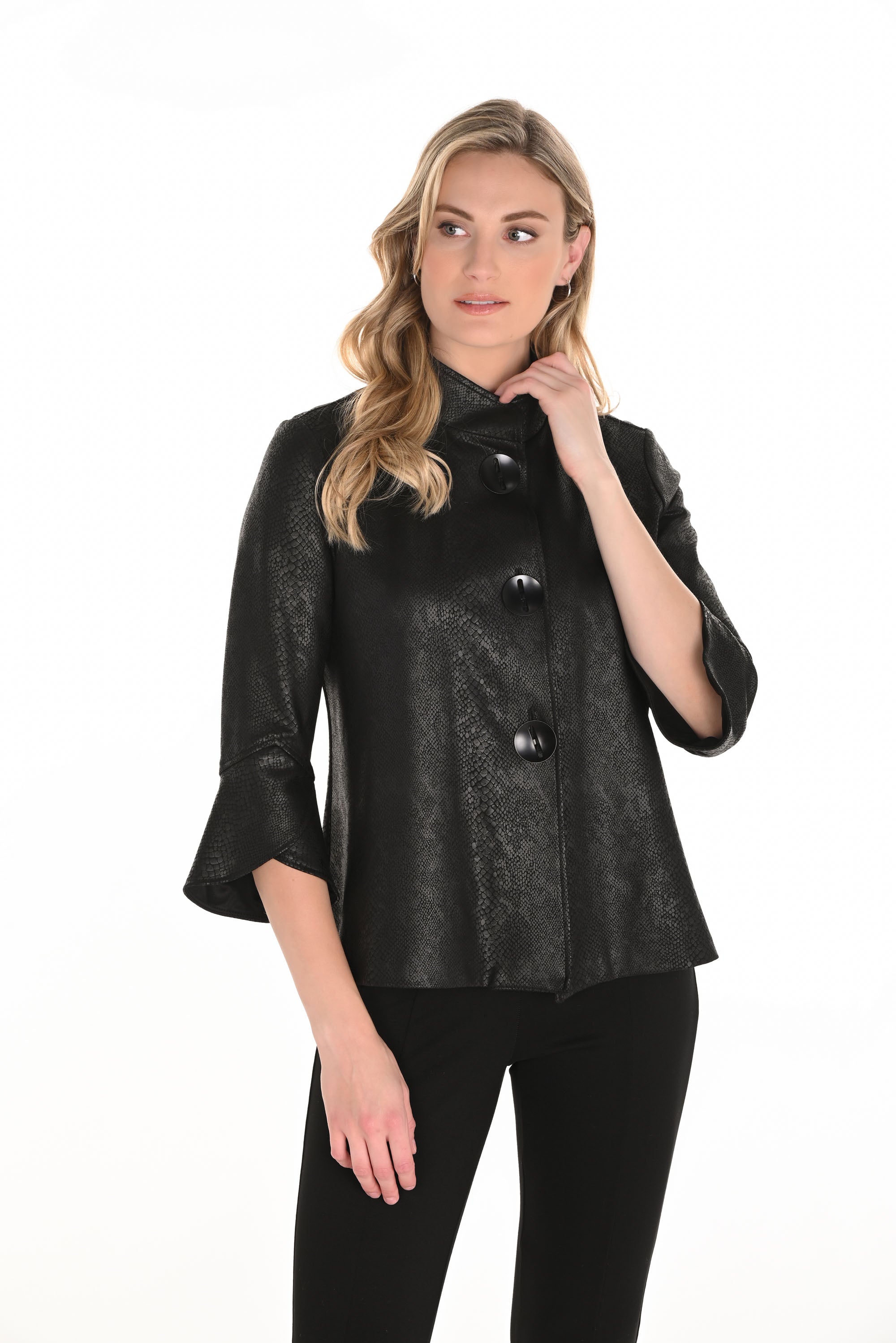 Introducing a striking Frank Lyman black snake skin 3-button jacket, designed to make a bold statement. This sophisticated jacket features a sleek snake skin texture that adds a touch of edge to its polished silhouette. The 3/4 bell sleeves bring graceful movement, while the stand collar enhances its modern, structured look. Finished with a classic 3-button front closure, this versatile piece transitions seamlessly from day to evening, offering both elegance and contemporary flair.