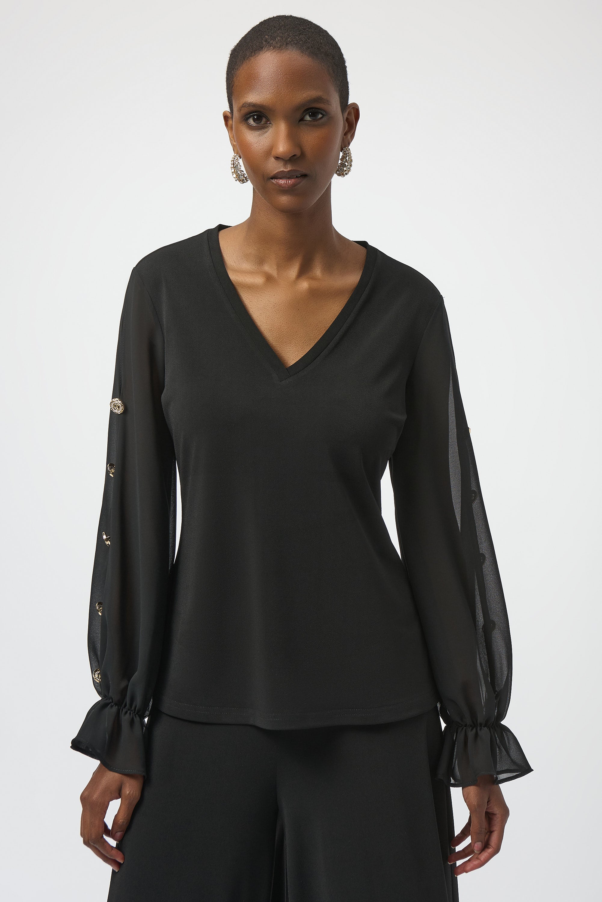 This Joseph Ribkoff top features a fitted moss crepe bodice with a sophisticated V-shaped neckline. Its standout chiffon ruffled puff sleeves enhance its elegance, while the gold and rhinestone buttons add refined detail. Subtle slits complete the design, creating a balanced look that is both stylish and polished. Perfect for elevating any wardrobe with expert craftsmanship and luxurious materials.