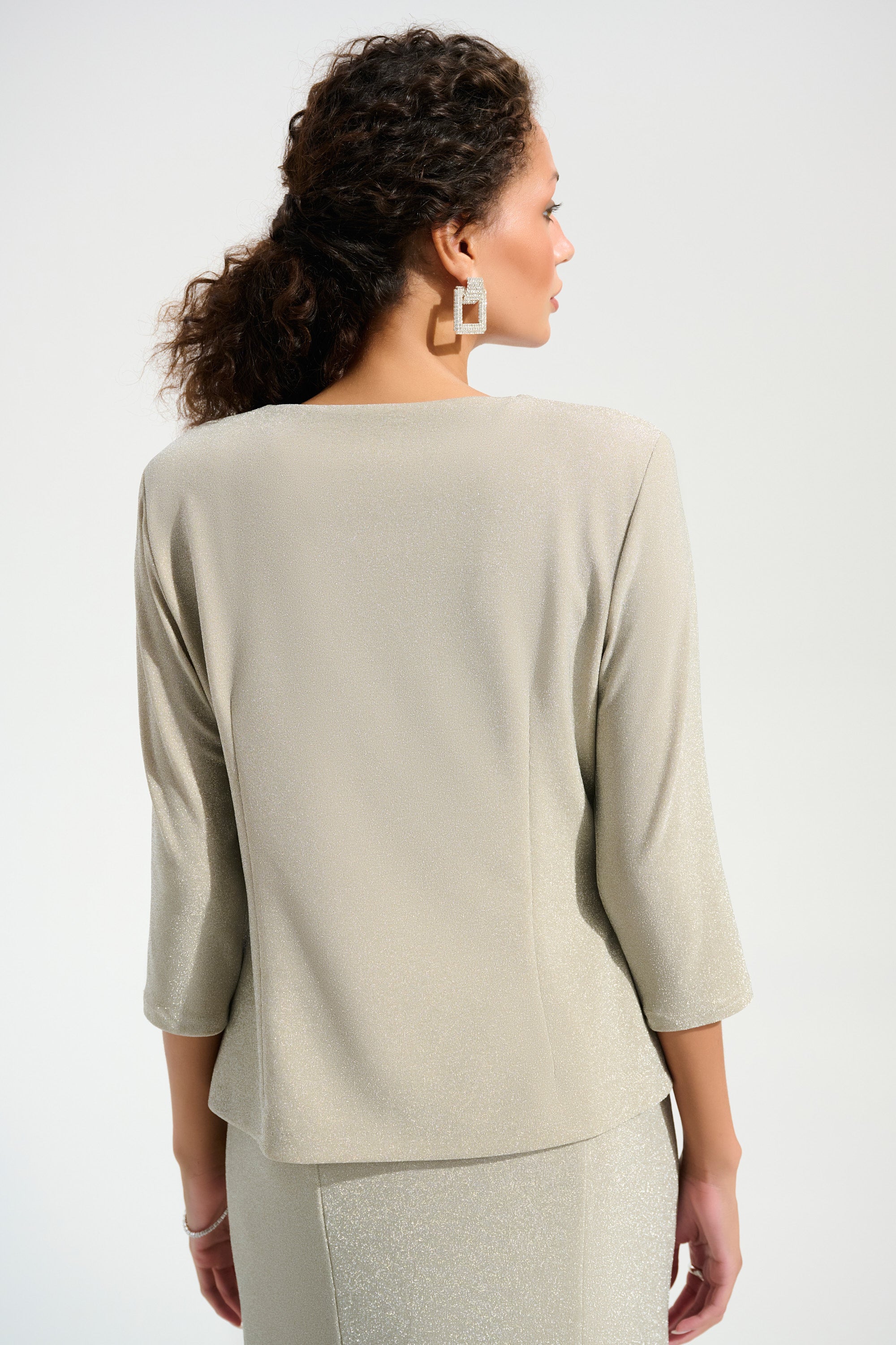 This Joseph Ribkoff fitted jacket and camisole set combines elegance and subtle sparkle for a refined layered look. The tailored overpiece features a scoop neckline and a defined waist inset, accentuated by a single rhinestone button closure. Complemented by a matching sleeveless camisole, this ensemble from the Signature collection offers a flattering fit and sophisticated style ideal for formal occasions or upscale events.