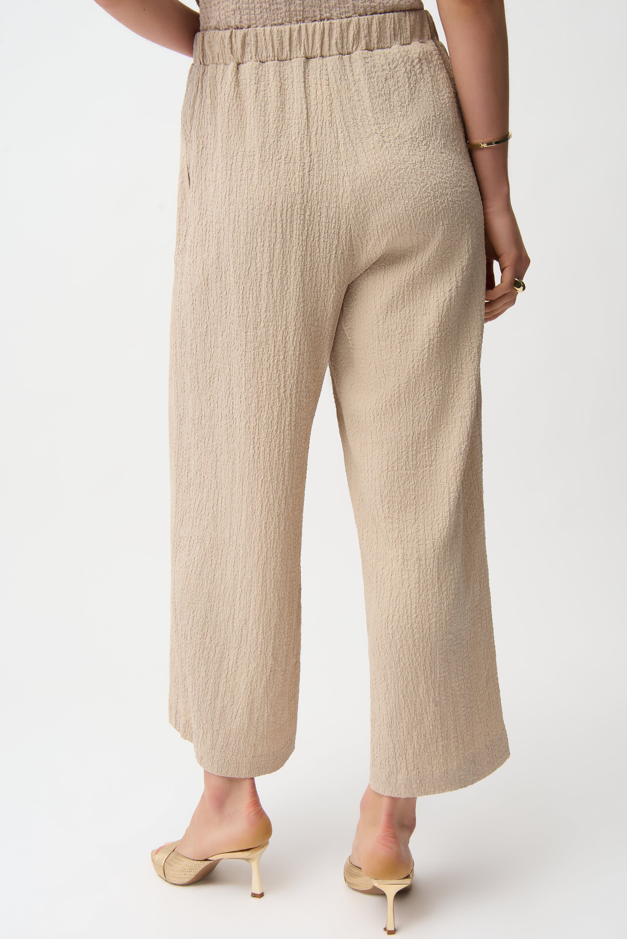 These Joseph Ribkoff pull-on crop pants combine relaxed comfort with refined detailing. Crafted with seersucker fabric, they feature a wide leg for airy movement and an elastic back waistband with a spaghetti cord tie for a customizable fit. Modified kangaroo pockets add a practical touch, balancing casual ease with expert tailoring. Ideal for dressing up or down, these pants offer both function and style in one versatile piece.