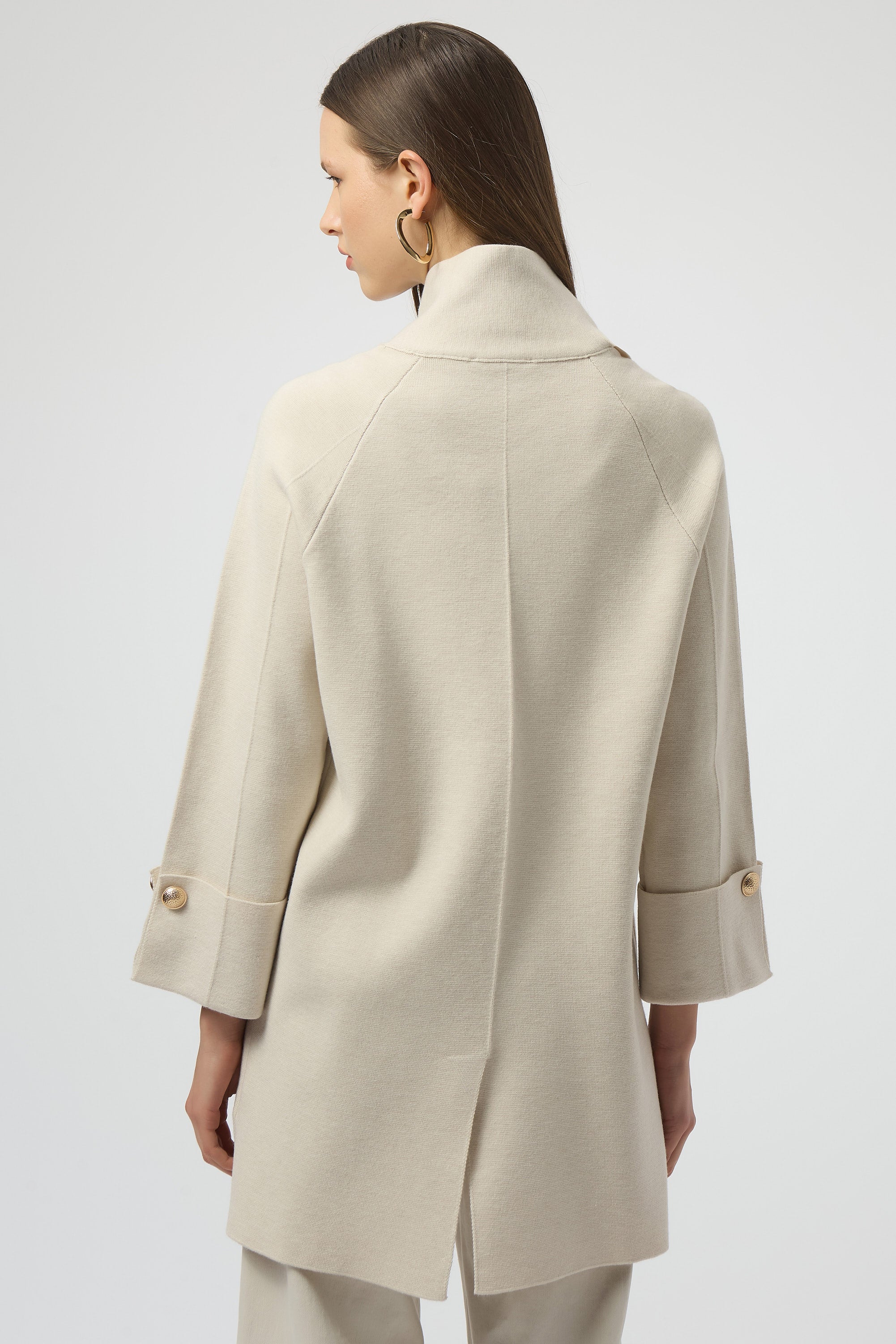 This Joseph Ribkoff coat combines expert tailoring with comfort, featuring a soft sweater knit that drapes elegantly. Its sophisticated overlap collar and cuffed sleeves add refined detail, while the practical front pockets enhance functionality. Ideal for those seeking a polished yet comfortable outer layer.