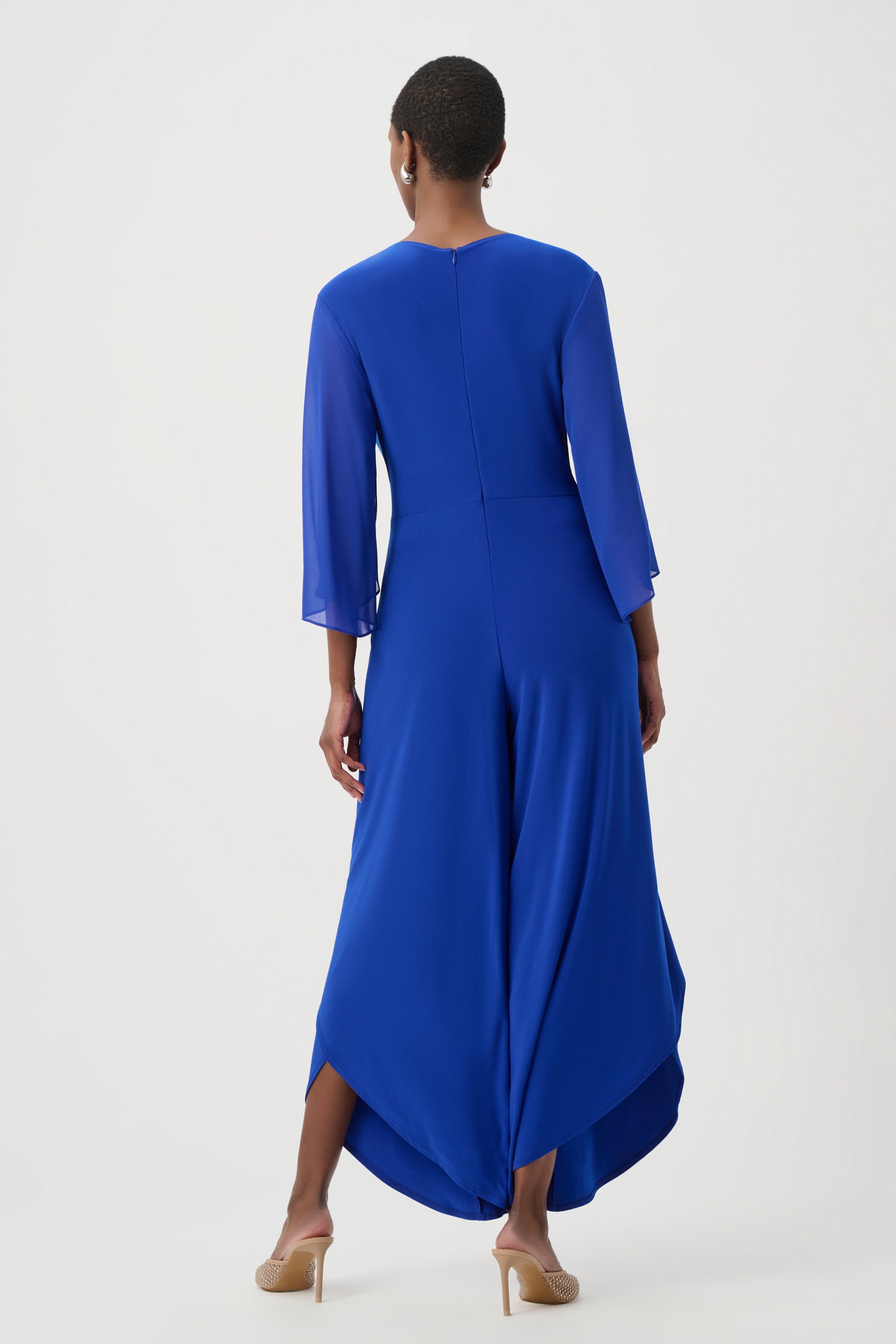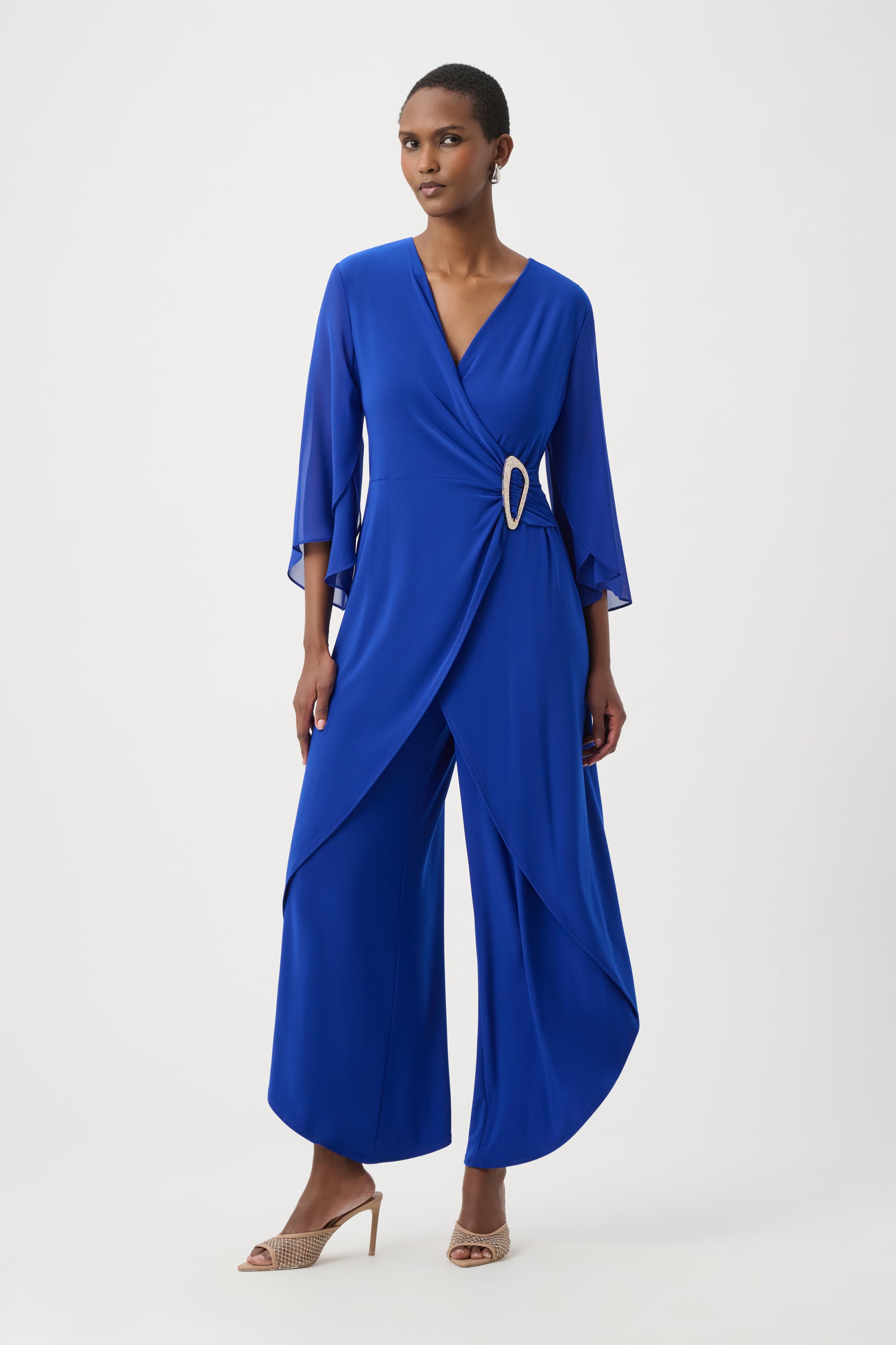 This Joseph Ribkoff culotte jumpsuit combines expert tailoring with sophisticated design. Crafted in a fluid, silky knit, it features elegant wrap-style details and airy chiffon tulip sleeves that enhance movement. A rhinestone embellishment at the waist adds refined sparkle, while the tulip-leg silhouette delivers a graceful, contemporary finish. Perfect for elevated occasions, this piece is a distinguished choice from the Signature collection.
