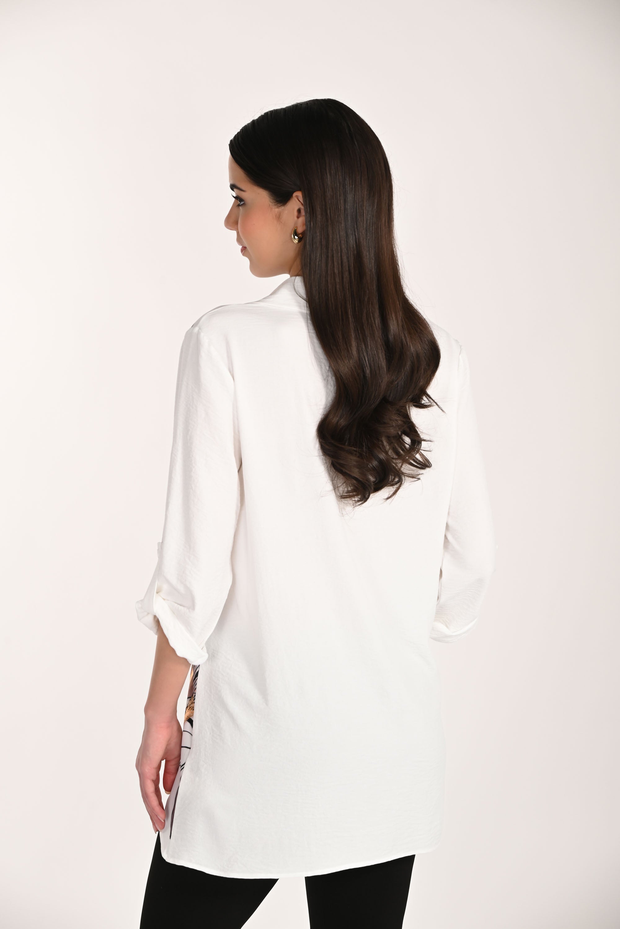 Details: long sleeves that can be rolled up to 3/4 length, front floral print, V-neckline with shirt collar.