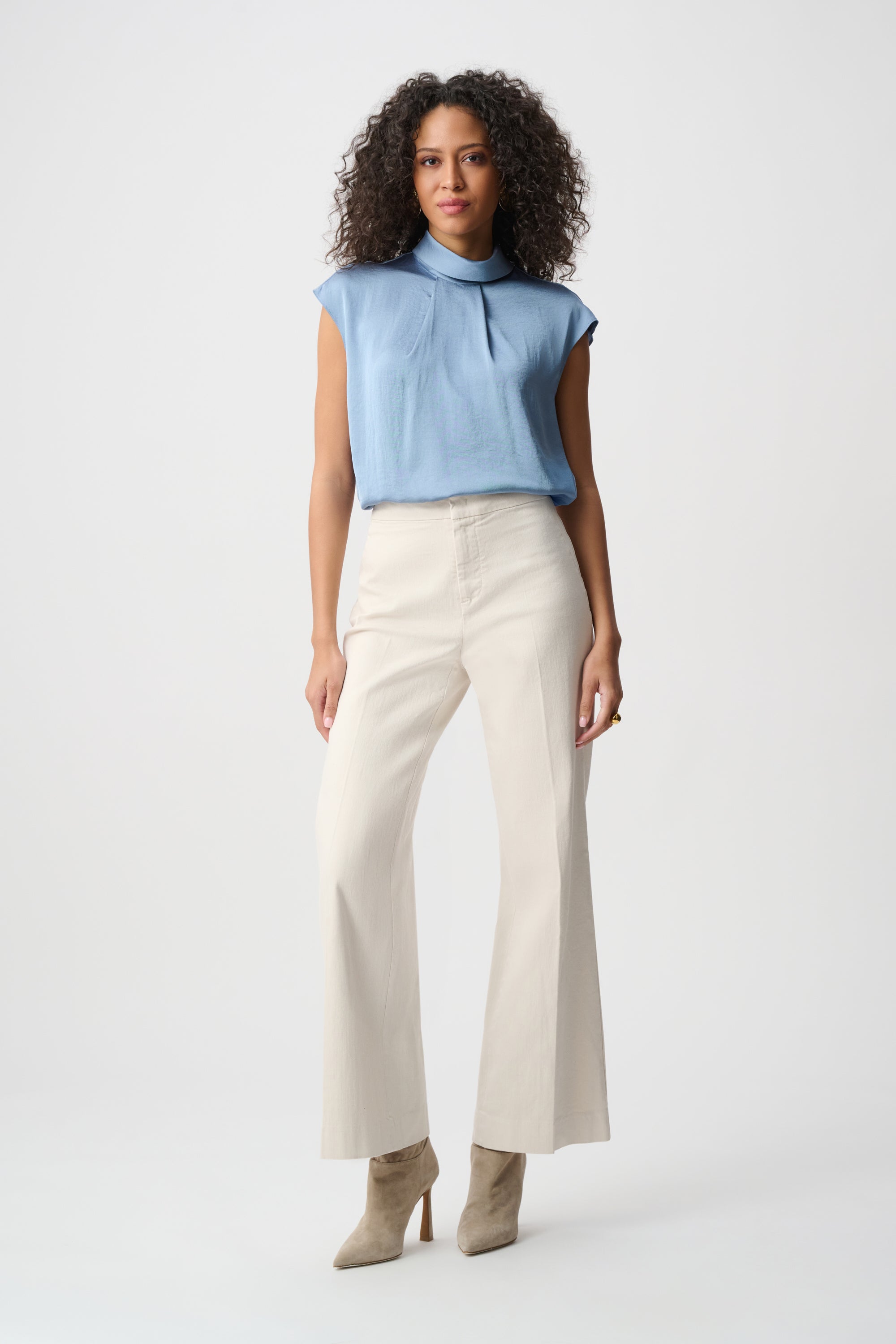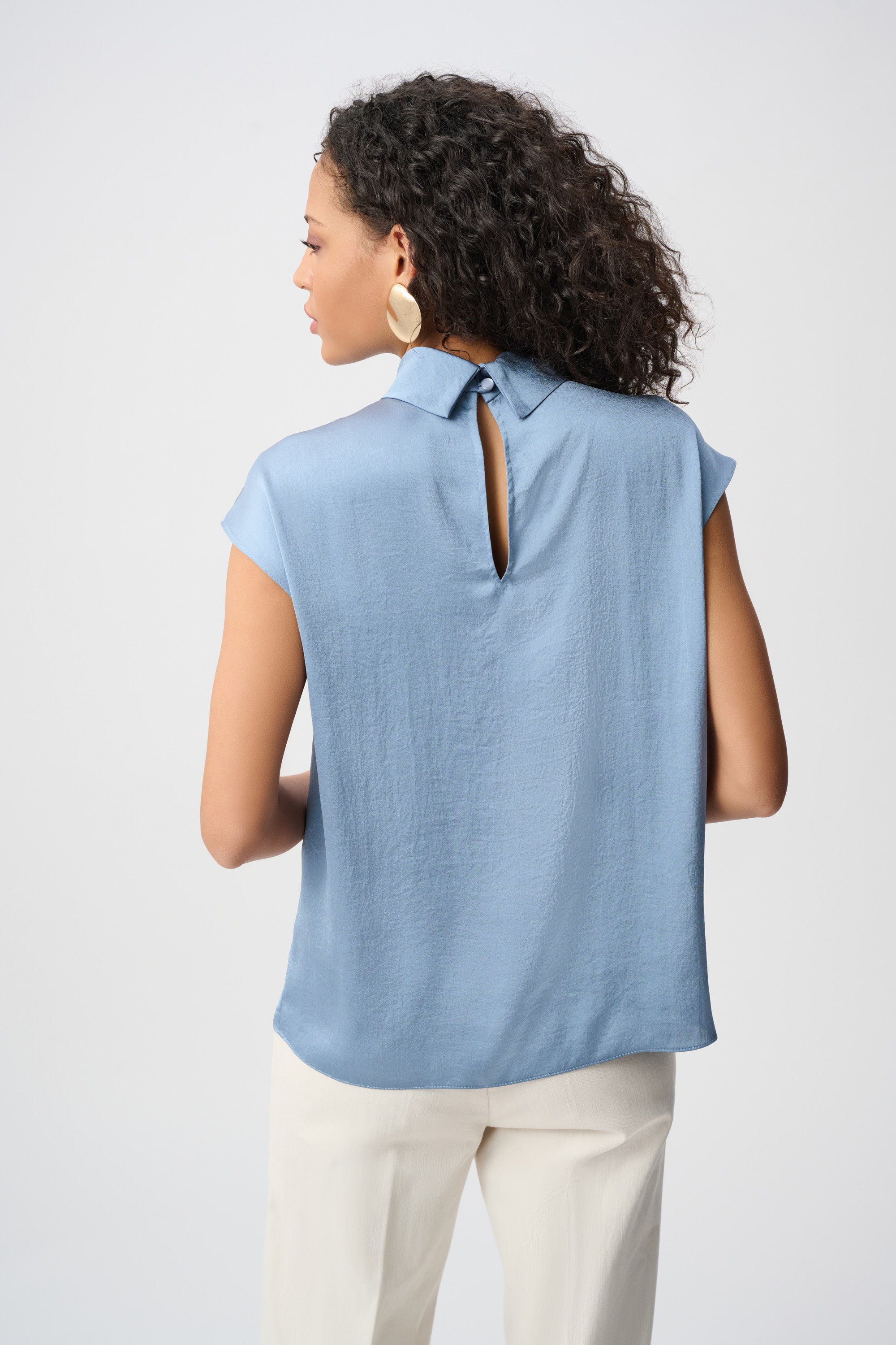 Elevate your everyday wardrobe with this Joseph Ribkoff satin turtleneck top, crafted from recycled hammered satin for a luxurious feel with a conscience. The structured turtleneck and subtle front pleats create a polished, refined silhouette perfect for both office and evening wear. Dolman short sleeves offer modern ease and flattering movement, while the back keyhole detail with shank button adds an unexpected sophisticated touch. A versatile essential that transitions seamlessly from day to night.