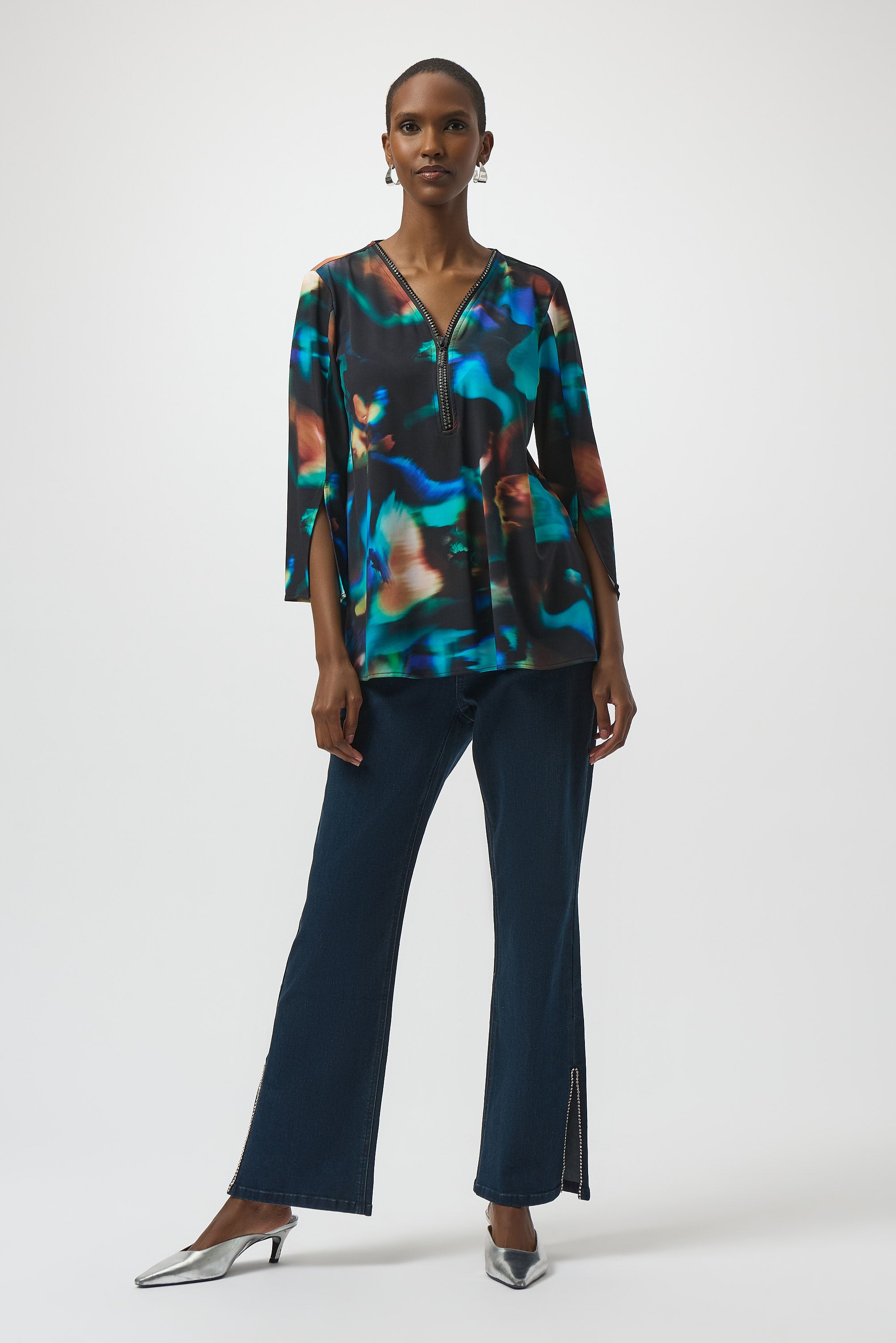This Joseph Ribkoff tunic combines artistry and elegance with its vibrant abstract print and figure-enhancing fit and flare design. The rhinestone-embellished zippered neckline adds a refined sparkle, while the sleeve slits provide subtle movement and style. A sophisticated back overlay detail completes the look, making this piece versatile for both professional and social settings. Crafted to deliver comfort without sacrificing chic appeal, it’s a standout addition to any wardrobe.