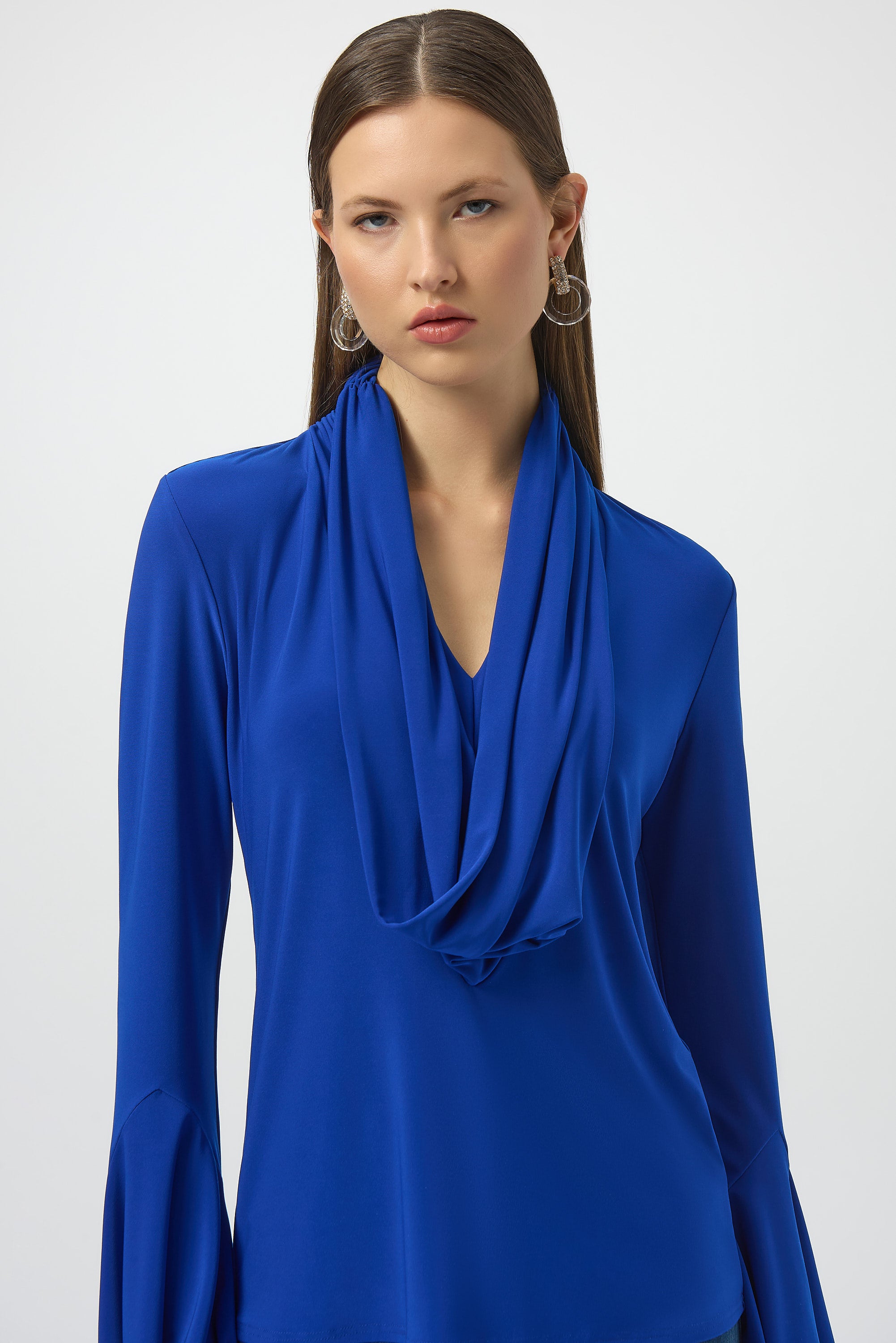 This Joseph Ribkoff fitted knit top offers a refined silhouette enhanced by long sleeves featuring striking bell cuffs. Its elegant cowl neck with subtle ruching adds depth and sophistication, making it a versatile choice for polished, contemporary wardrobes.
