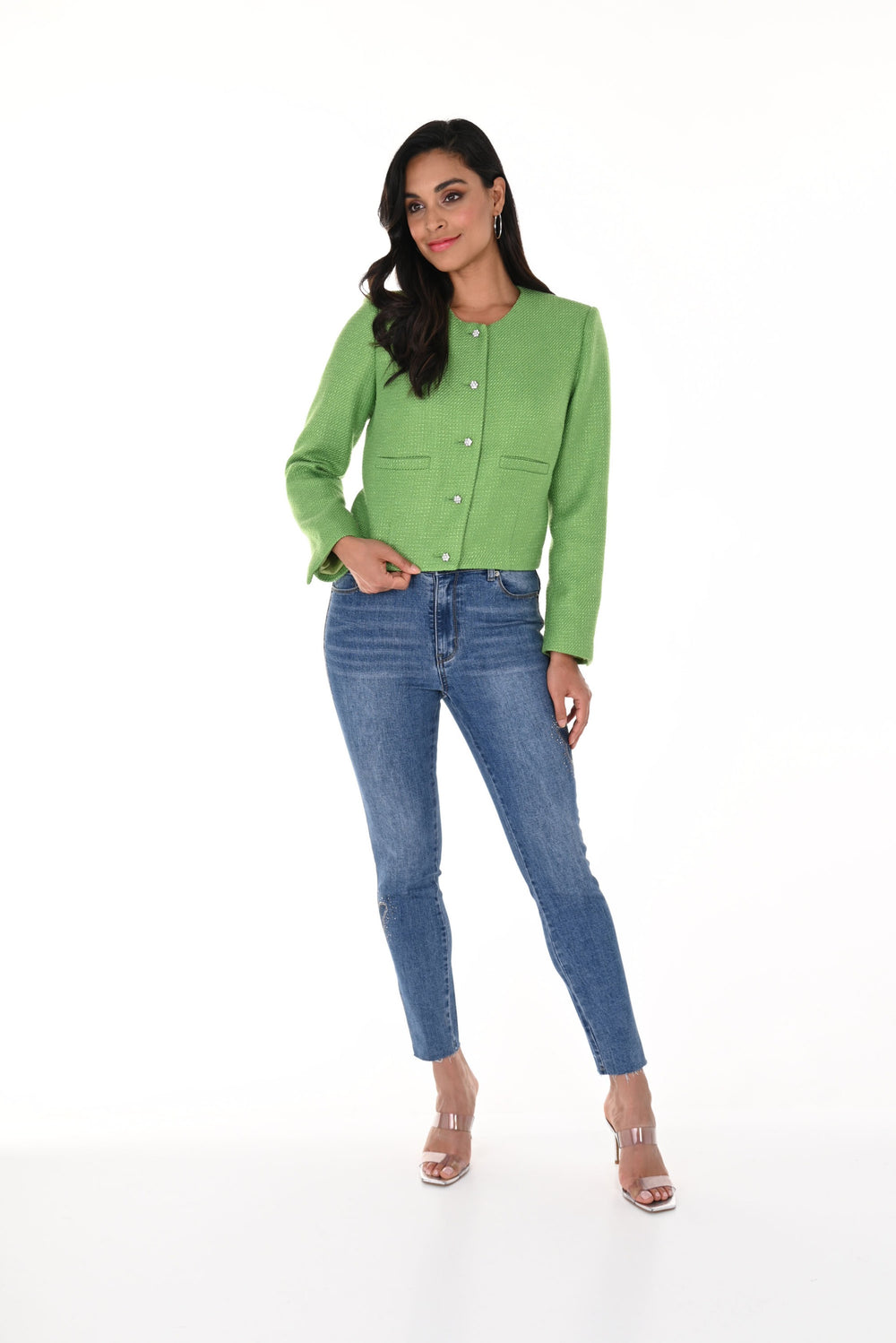 These Frank Lyman denim blue jean pants feature a sleek butterfly silhouette adorning the side, accentuated with sparkling rhinestone embellishments, add a touch of whimsical charm to any ensemble. This unique fusion of classic denim and delicate butterfly motifs exudes both sophistication and playful elegance.
