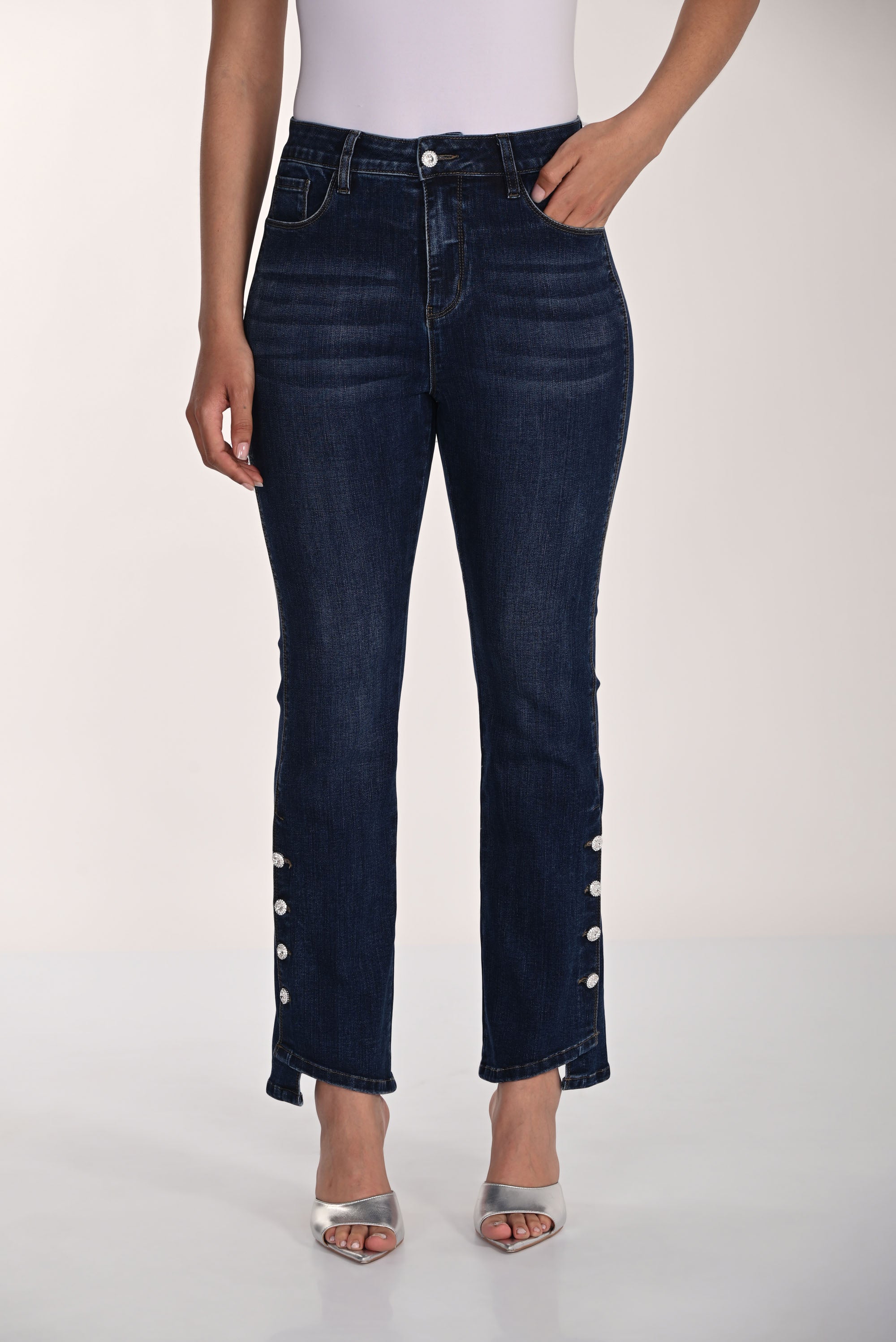 Frank Lyman's high-waisted slim jeans deliver refined versatility for your everyday wardrobe. Cut to flatter with a streamlined silhouette, these full-length jeans transition seamlessly from casual wear to semi-formal settings. Thoughtful details include functional pockets and subtle buttoned embellishments that add understated sophistication. The clean, classic design pairs effortlessly with virtually any top, making these jeans an intelligent investment for a cohesive, polished closet.