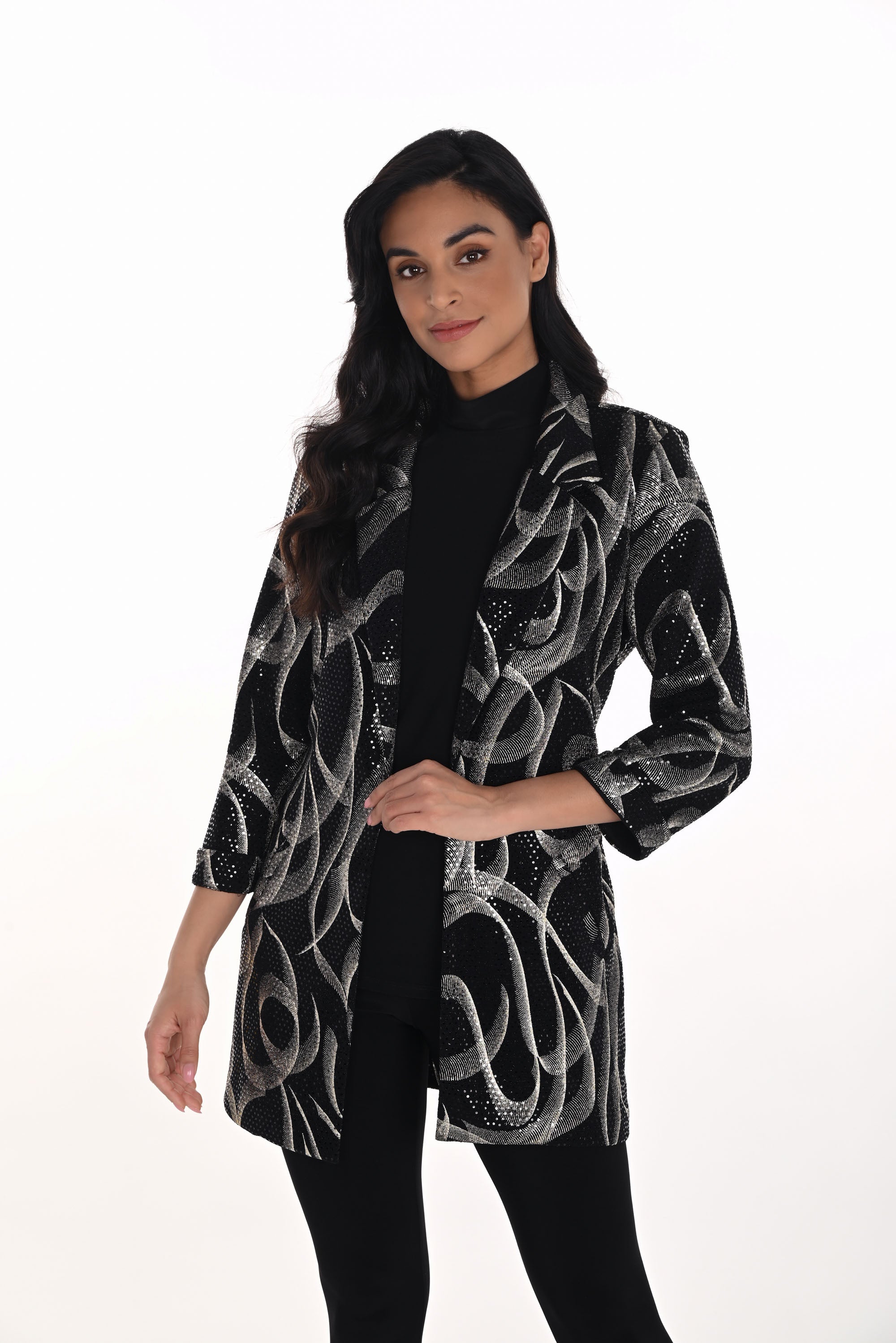 La chaqueta de frente abierto Frank Lyman (Estilo 254148) es una obra maestra de elegancia nocturna y arte moderno. Esta sofisticada prenda se define por su impactante motivo abstracto en espiral plateado que fluye sobre un lienzo negro profundo, creando un look de alto contraste que exige atención. Diseñada para la mujer que valora tanto la comodidad como una presencia imponente, esta chaqueta sirve como la "pieza final" definitiva para cualquier conjunto formal o profesional.