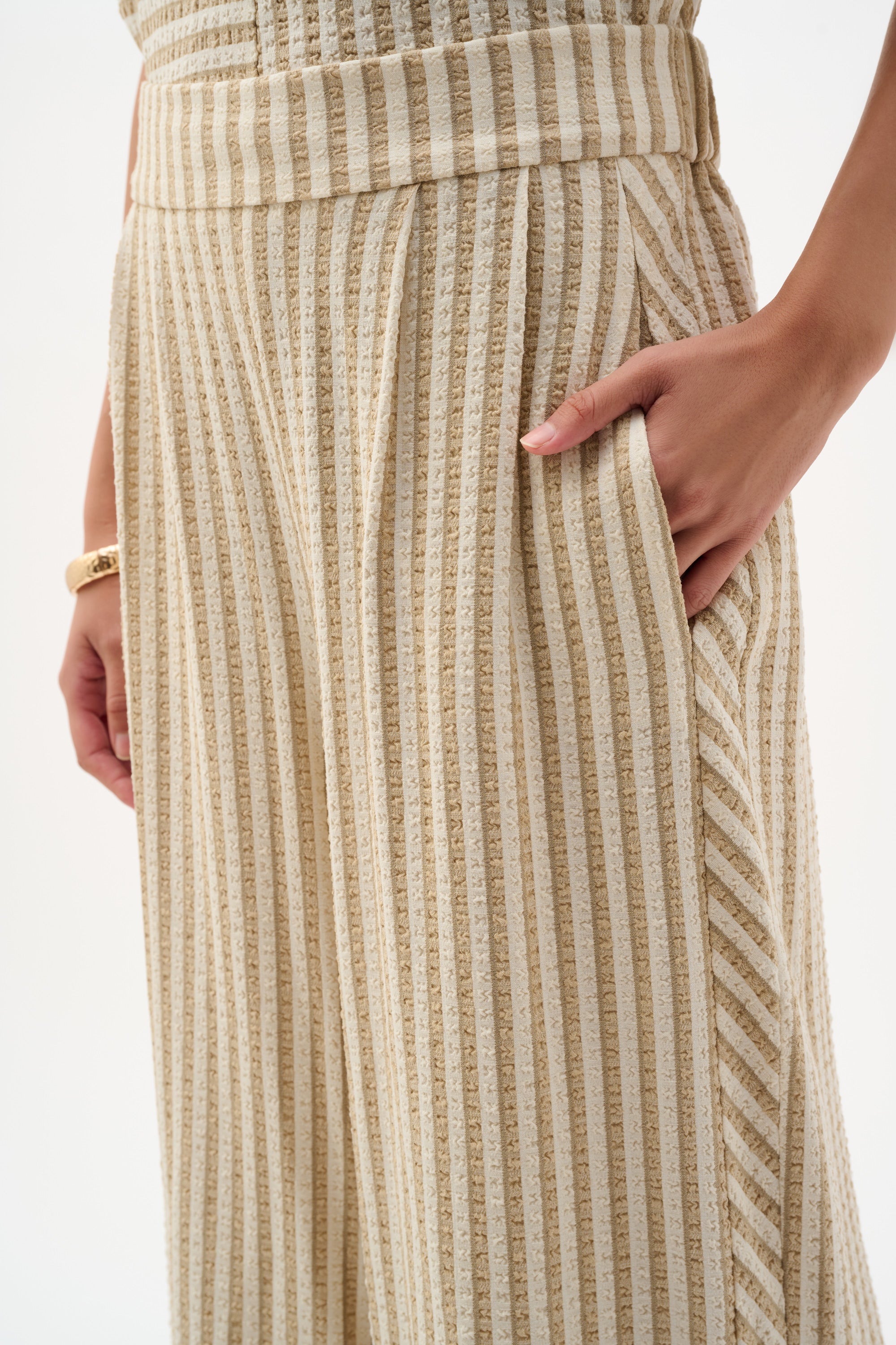 Una sofisticada combinación de texturas y líneas, estos pantalones de pierna ancha presentan rayas teñidas en hilo que se ondulan sobre una tela tejida de primera calidad. El intrincado tejido añade una profundidad táctil y una dimensión sutil a la prenda, elevando el clásico motivo a rayas a una prenda de declaración moderna.