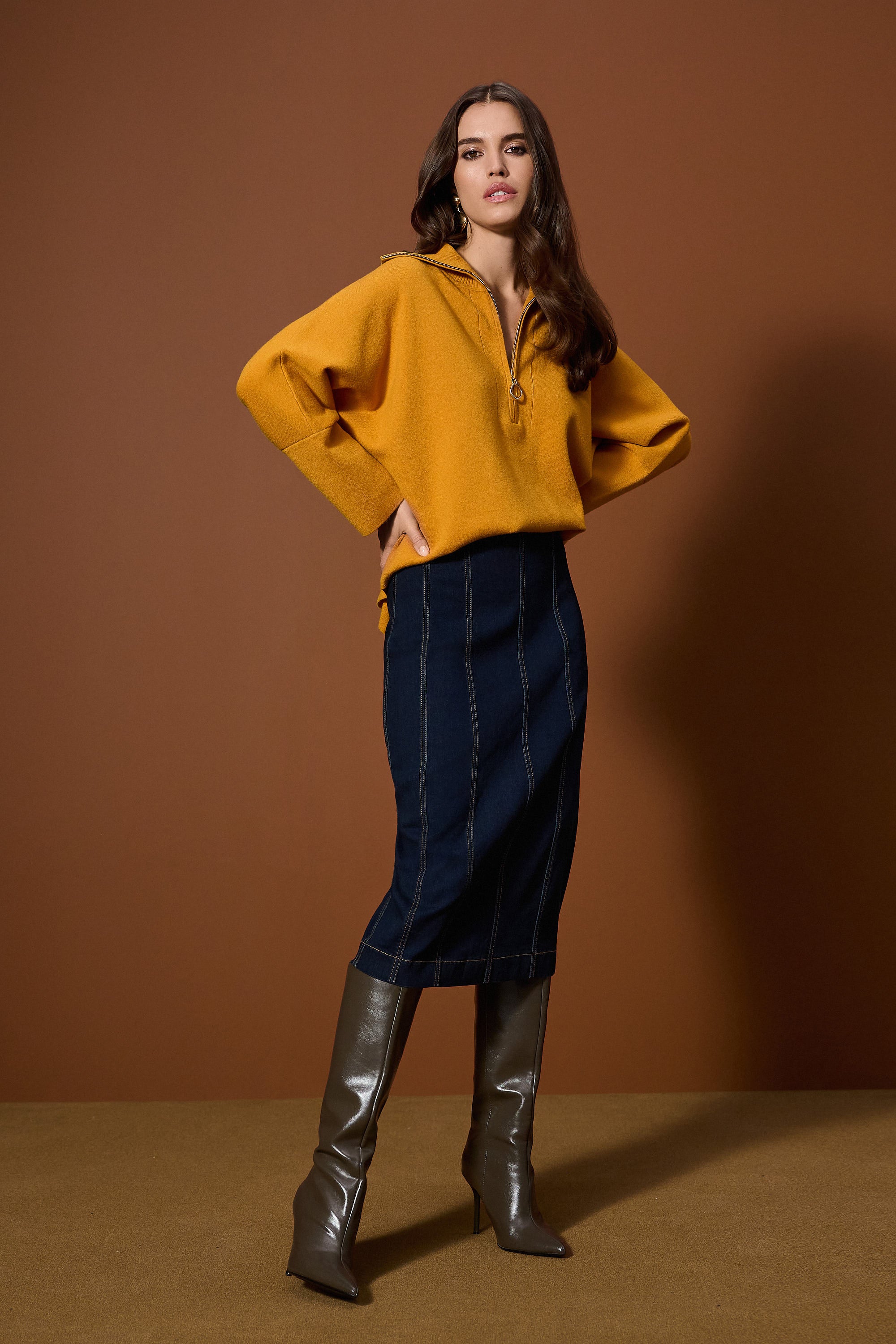 Dale un toque de distinción a tu armario con la falda tubo con paneles de mezclilla elástica Joseph Ribkoff, modelo 253996. Confeccionada en mezclilla Repreve® ultrasuave y elástica (un tejido sostenible hecho con botellas de plástico recicladas), esta falda presenta un elegante diseño de paneles con costuras en contraste que realzan tu silueta. La abertura trasera permite un movimiento cómodo, ideal para usarla todo el día. Perfecta para la primavera, combínala con un top de punto ligero y botas hasta la rodilla para un look elegante y moderno.
