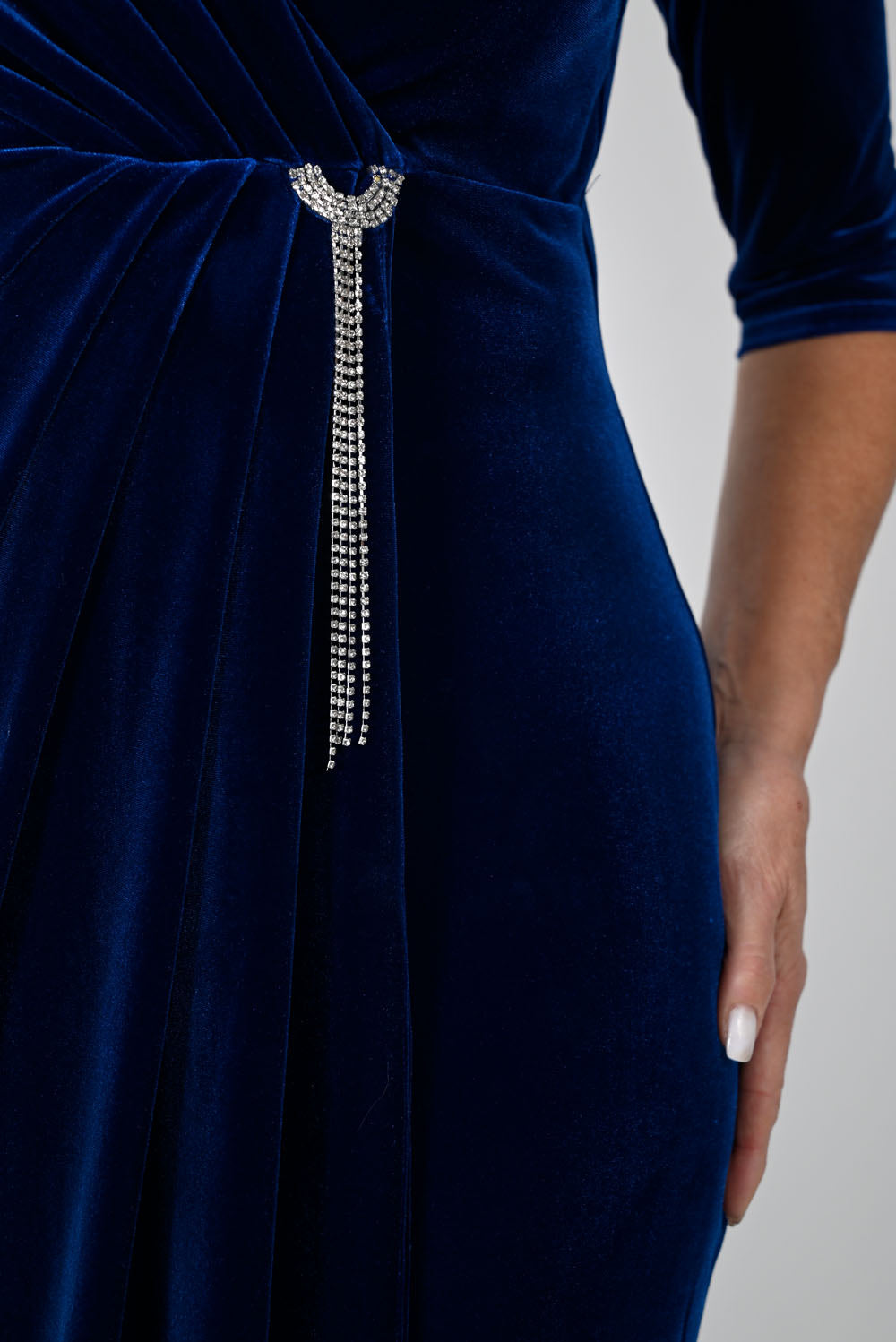 Cette robe portefeuille couleur saphir royal respire l'élégance royale avec sa teinte captivante et ses ornements argentés raffinés ornant la taille, ajoutant une touche de glamour en toute occasion. Son design gracieux est sublimé par ses manches mi-longues flatteuses, ce qui en fait un choix intemporel pour celles qui recherchent un mélange de sophistication et de style.