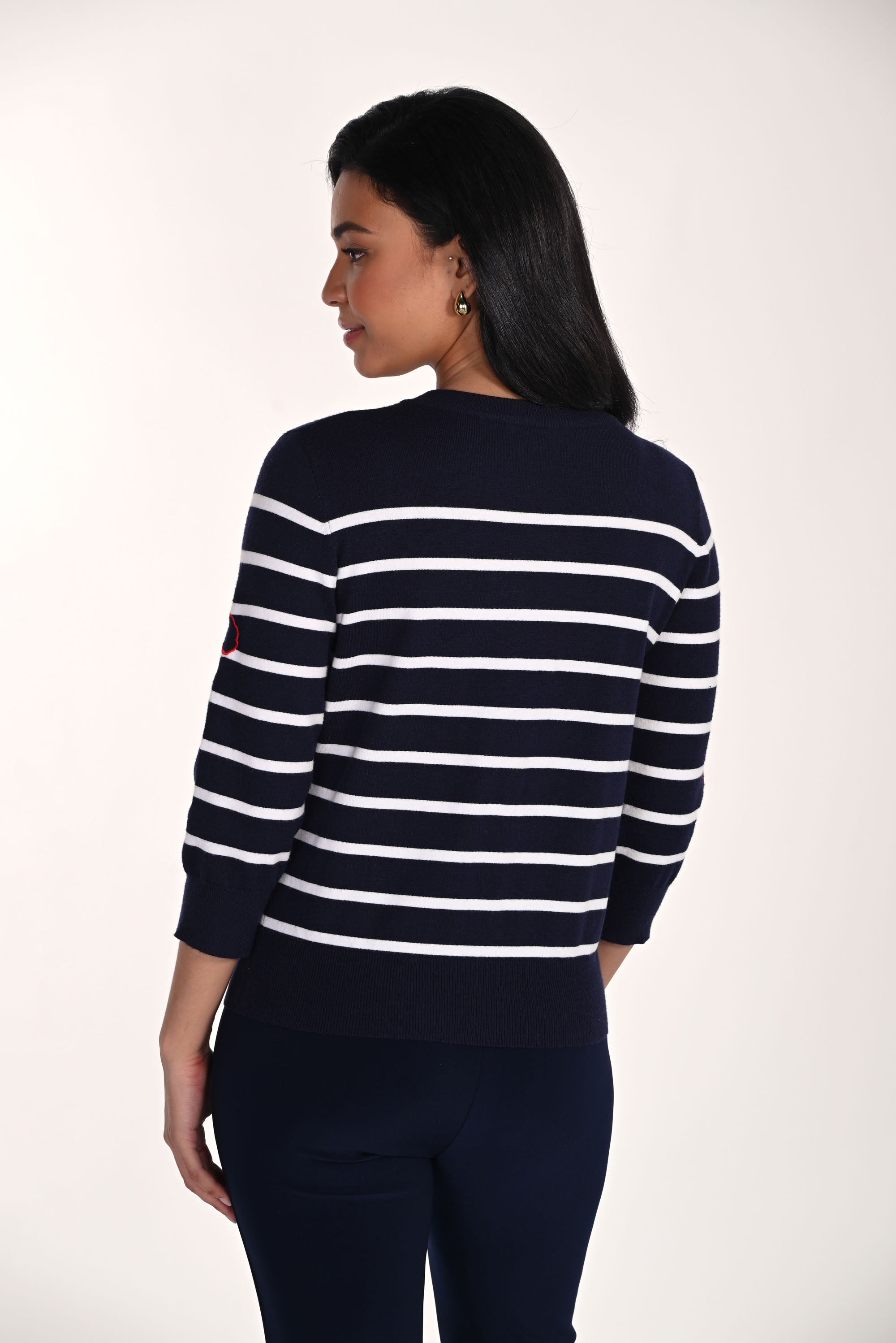 Sublimez votre garde-robe quotidienne avec le cardigan rayé Frank Lyman, une pièce sophistiquée et indispensable qui se prête aussi bien aux tenues de bureau qu'aux looks décontractés. Ce modèle mi-long présente une encolure ras du cou raffinée et des manches trois-quarts, pour une coupe flatteuse et classique. Le motif rayé discret se marie à merveille avec de délicats boutons dorés, apportant une touche d'élégance sobre à toutes vos tenues. Porté sur une robe ou avec un pantalon tailleur, ce cardigan polyvalent vous assure un style impeccable et une sophistication naturelle.