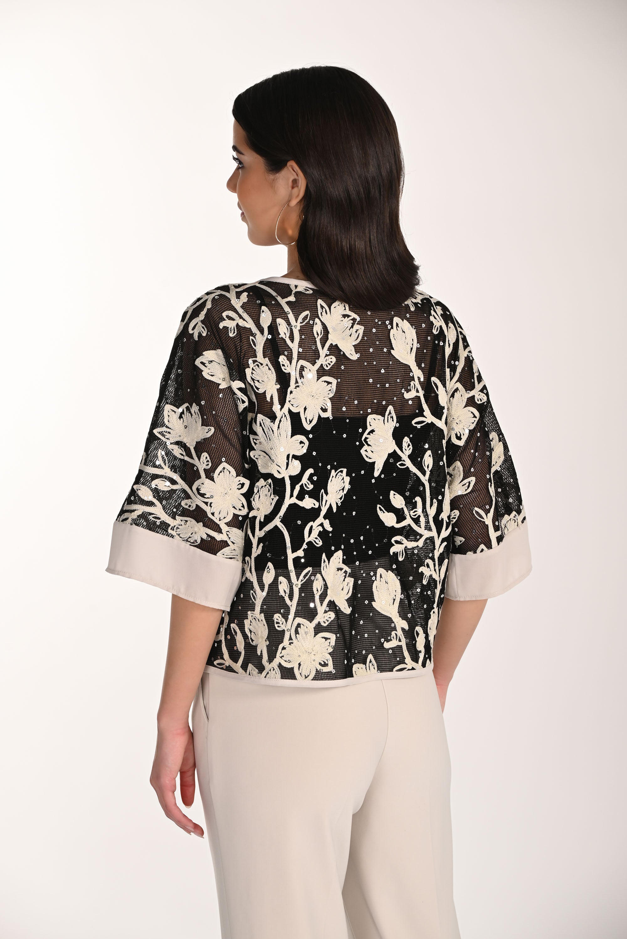 Sublimez votre garde-robe avec ce haut Frank Lyman en maille soyeuse et résille, une pièce sophistiquée alliant élégance et style contemporain. Son encolure bateau flatteuse et ses manches chauve-souris 3/4 fluides créent une silhouette raffinée, tandis que ses broderies florales raffinées et ses ornements bijoux sur l'ensemble lui confèrent une dimension luxueuse. Confectionné en maille soyeuse haut de gamme avec des touches de résille transparente, ce haut se porte aussi bien en journée qu'en soirée. Parfait pour celles qui apprécient la qualité de la confection et les détails accrocheurs qui font sensation.