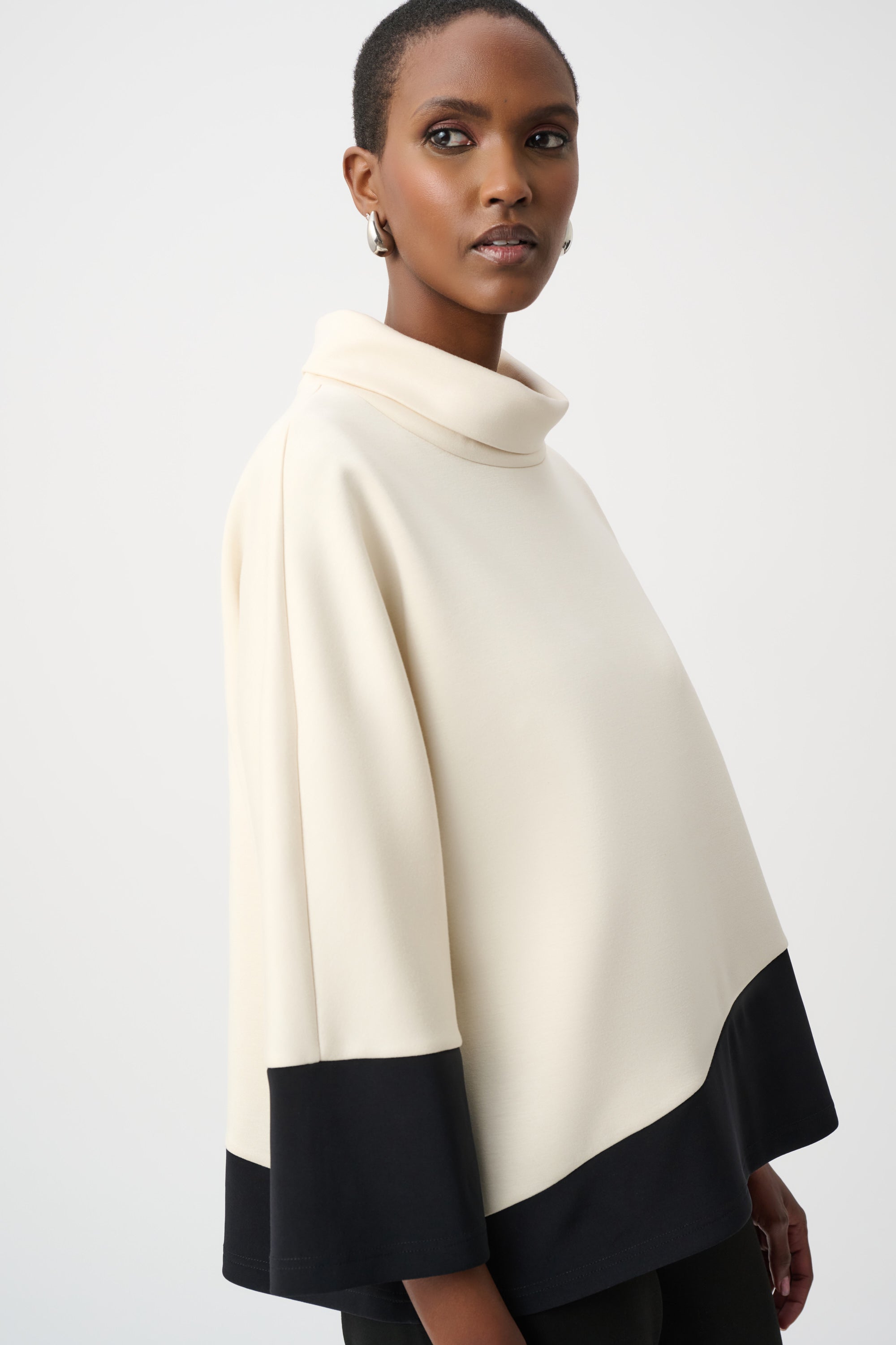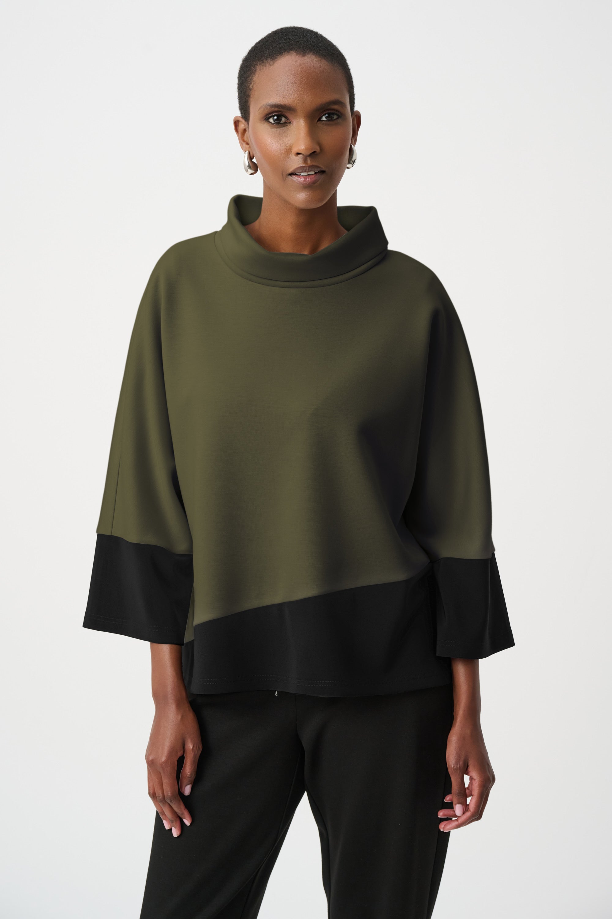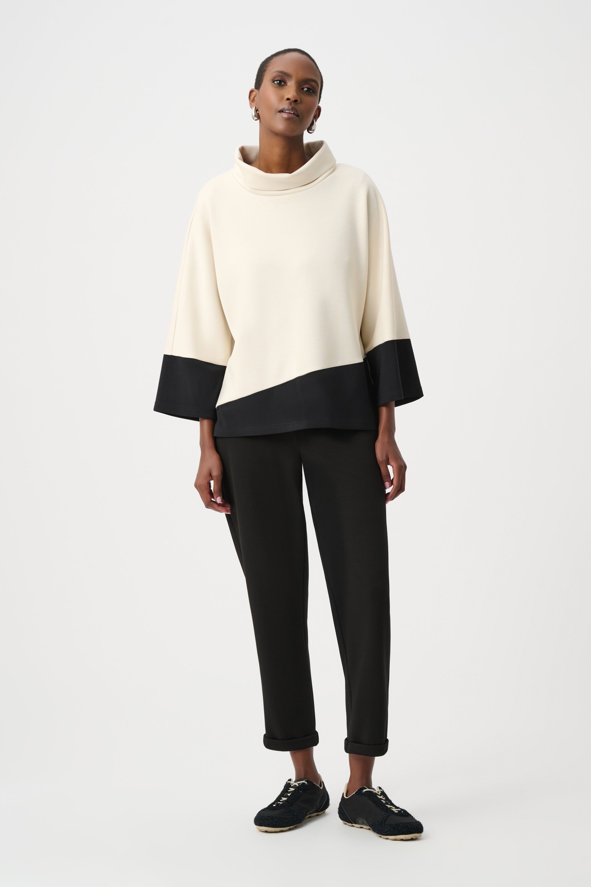 D'une élégance naturelle, ce top trapèze Joseph Ribkoff associe maille soyeuse, jersey et scuba pour un équilibre parfait entre structure et fluidité. Sa coupe décontractée est rehaussée de longues manches dolman et d'un col roulé douillet, tandis que son design color block audacieux lui confère un style résolument contemporain. Idéal à superposer ou à porter seul, ce modèle polyvalent se prête aussi bien à une tenue de jour qu'à une tenue de soirée.