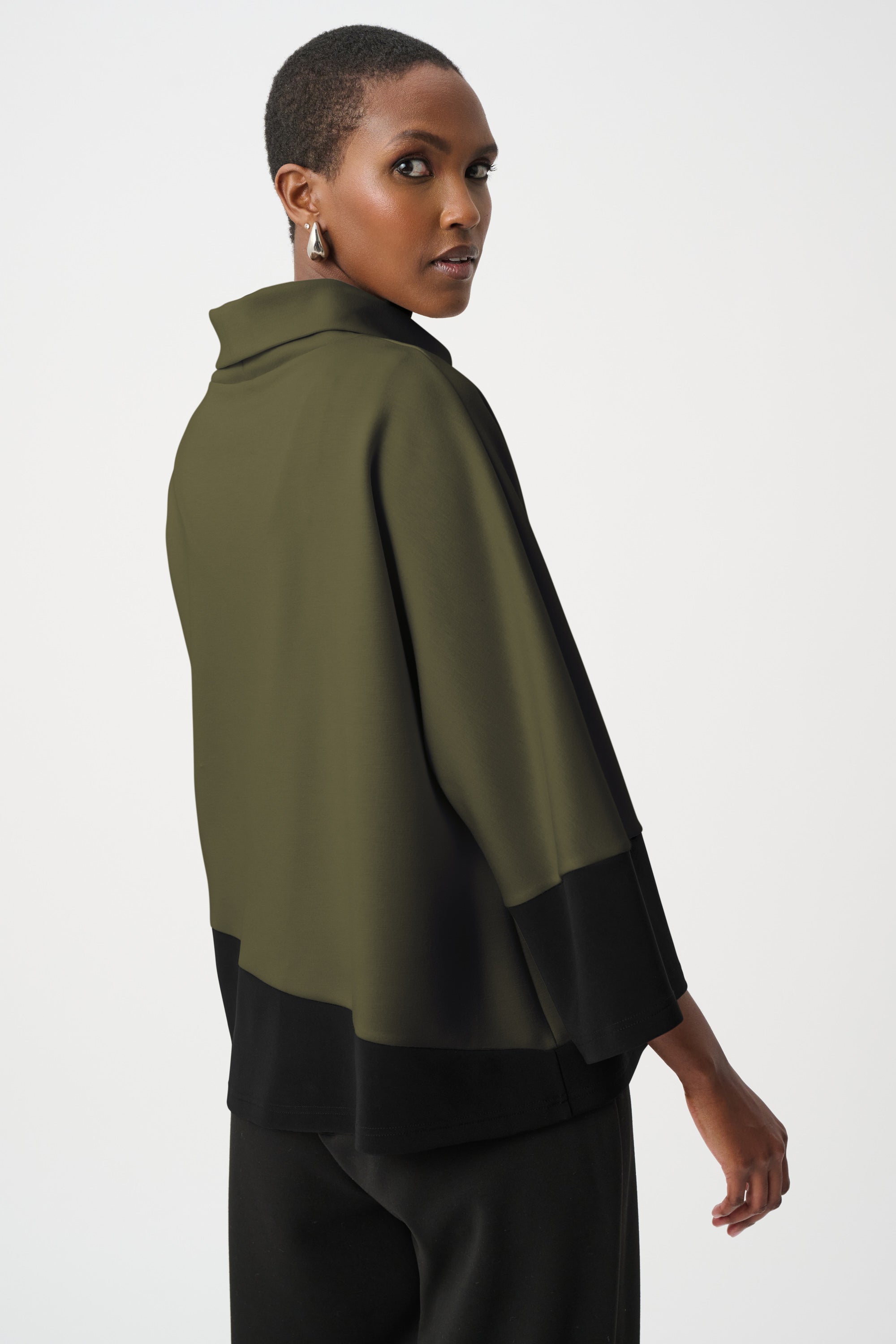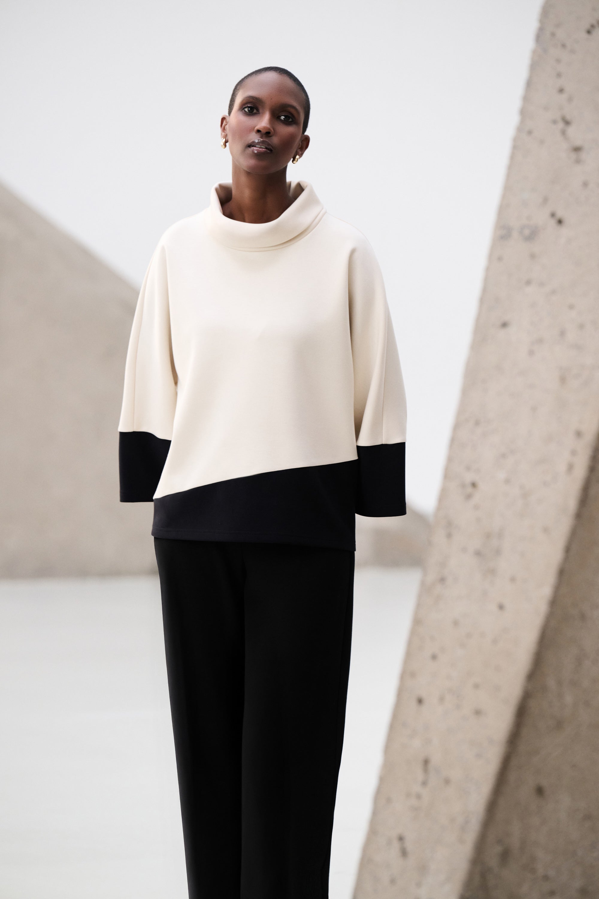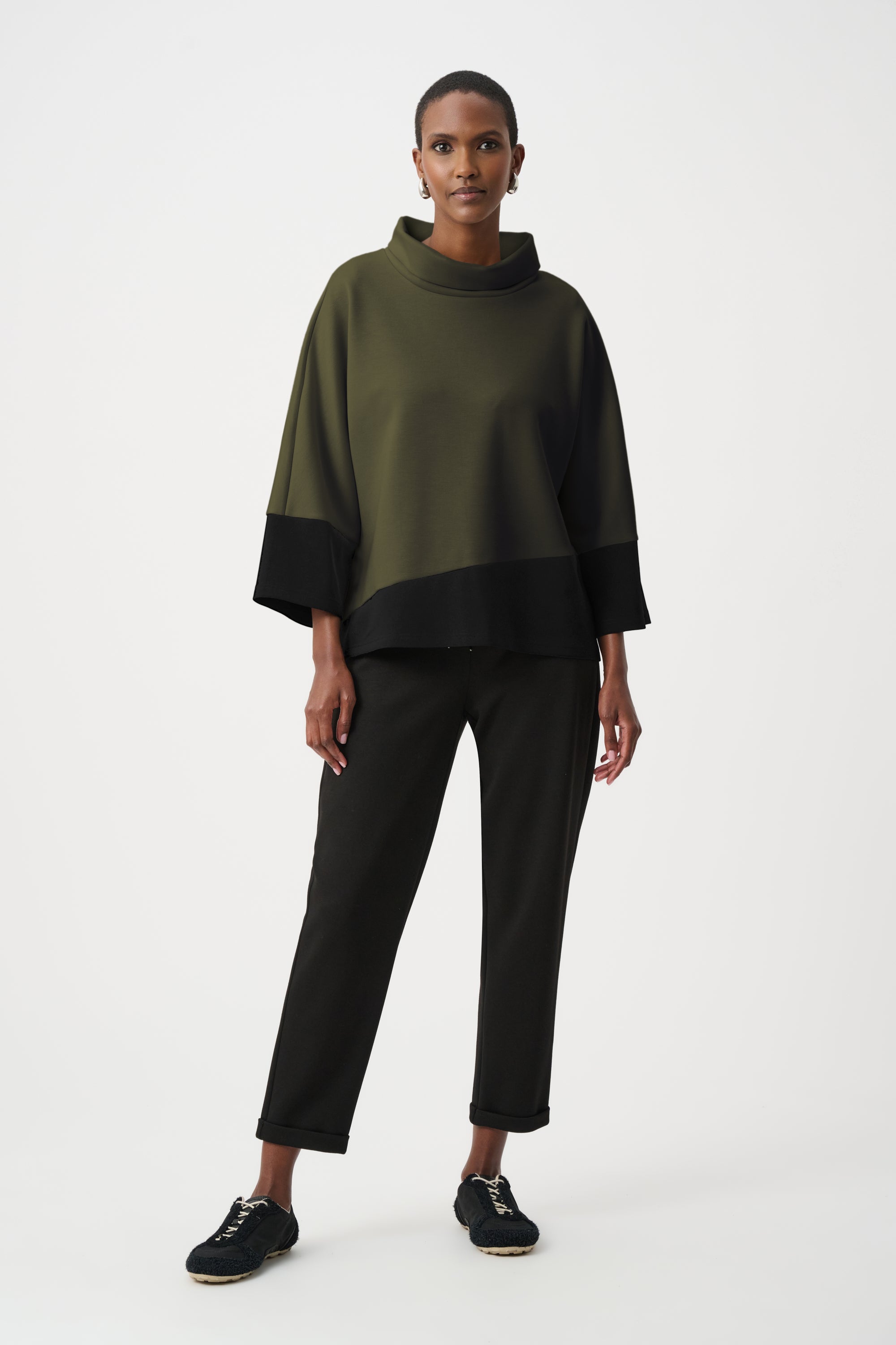 D'une élégance naturelle, ce top trapèze Joseph Ribkoff associe maille soyeuse, jersey et scuba pour un équilibre parfait entre structure et fluidité. Sa coupe décontractée est rehaussée de longues manches dolman et d'un col roulé douillet, tandis que son design color block audacieux lui confère un style résolument contemporain. Idéal à superposer ou à porter seul, ce modèle polyvalent se prête aussi bien à une tenue de jour qu'à une tenue de soirée.