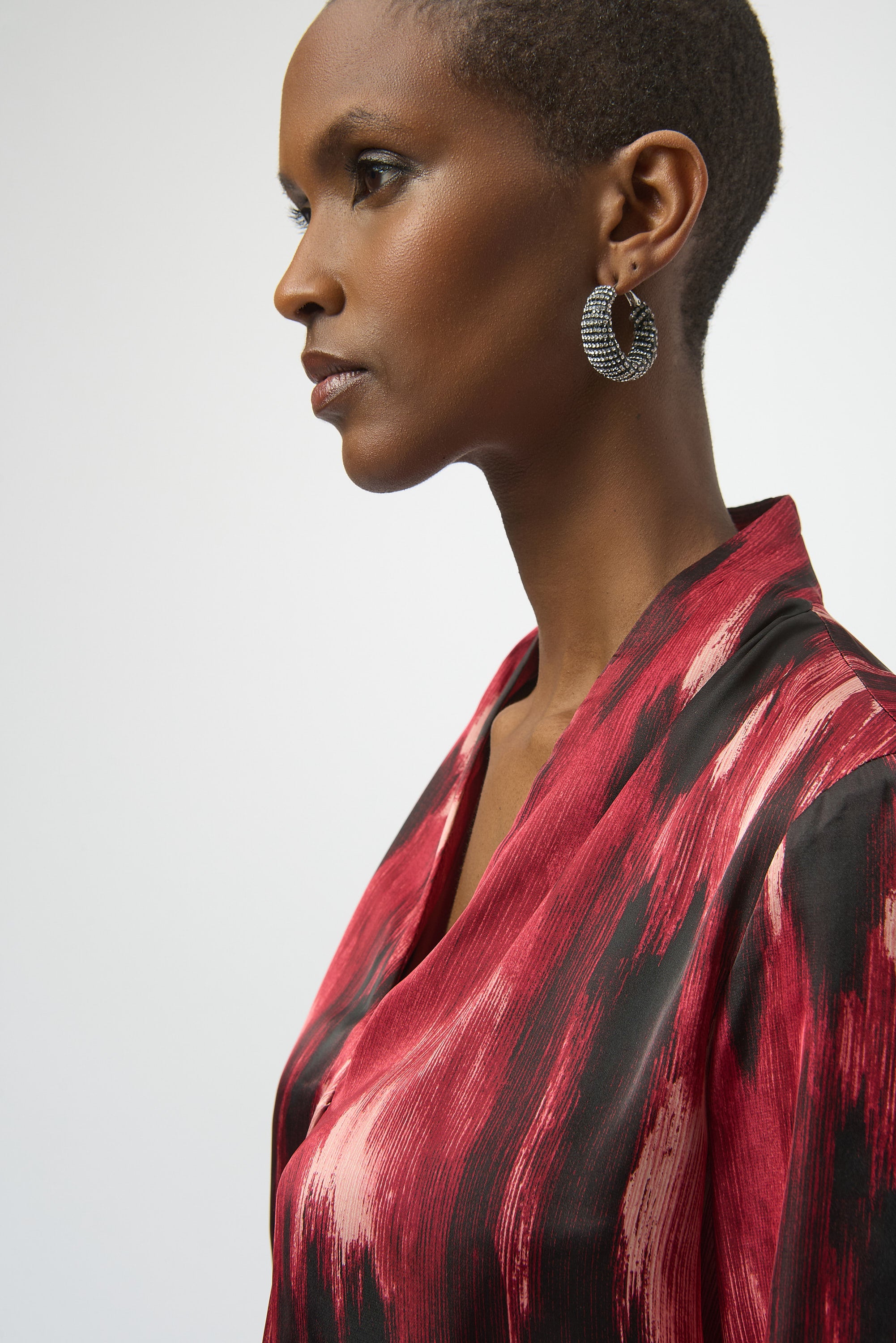 Cet élégant haut en satin arbore un imprimé abstrait saisissant qui lui confère une touche artistique sophistiquée. Son décolleté en V raffiné, orné d'un délicat pli sur le devant, sublime sa silhouette droite et raffinée, ce qui en fait une pièce polyvalente, idéale pour les occasions professionnelles comme pour les occasions élégantes.
