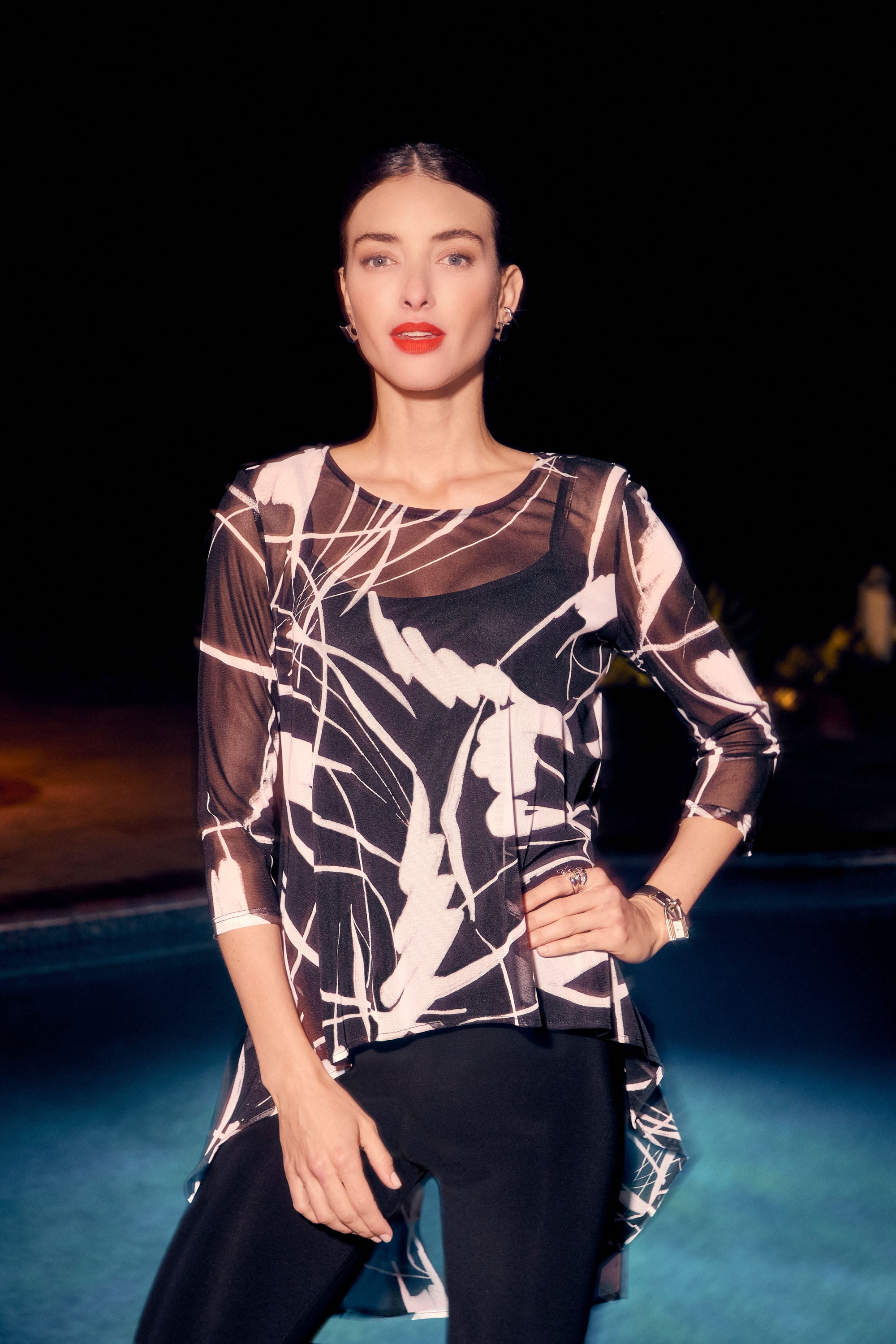 Details: high-low silhouette, abstract print, 3/4 sleeves