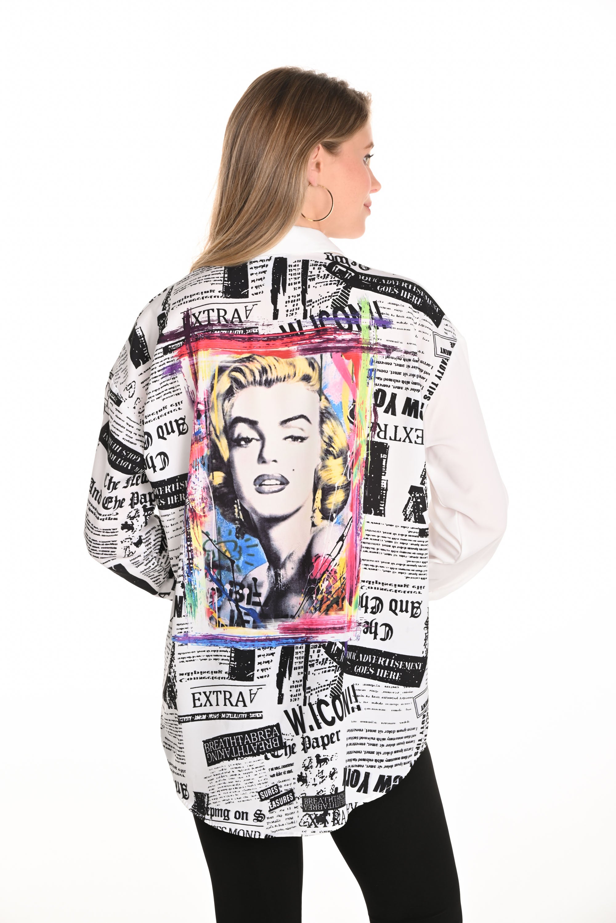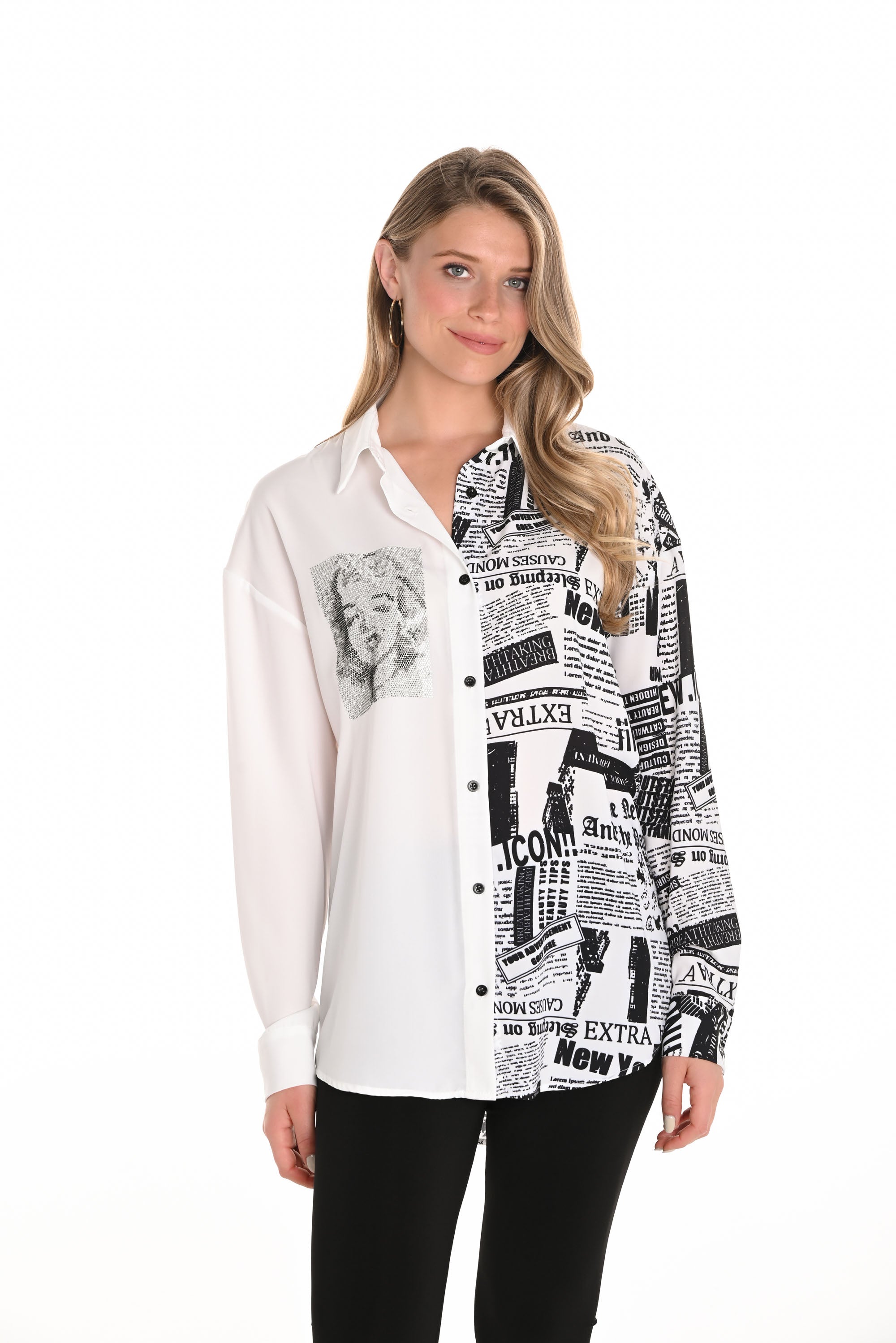 Introducing the sleek and versatile Frank Lyman buttoned blouse, a chic and minimalistic piece that elevates any outfit. With a button closure, sophisticated shirt collar, and eye-catching graphic print, this hip-length blouse is perfect for any occasion. The long, straight sleeves add a touch of elegance to your wardrobe. Upgrade your style with this must-have addition.